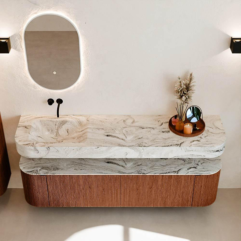 MONDIAZ THOR-DLUX 180cm badmeubel ronding links + rechts kleur Ruby met 2 lades en 2 deuren. Vrijhangende wastafel CLOUD Links zonder kraangat kleur Glace.