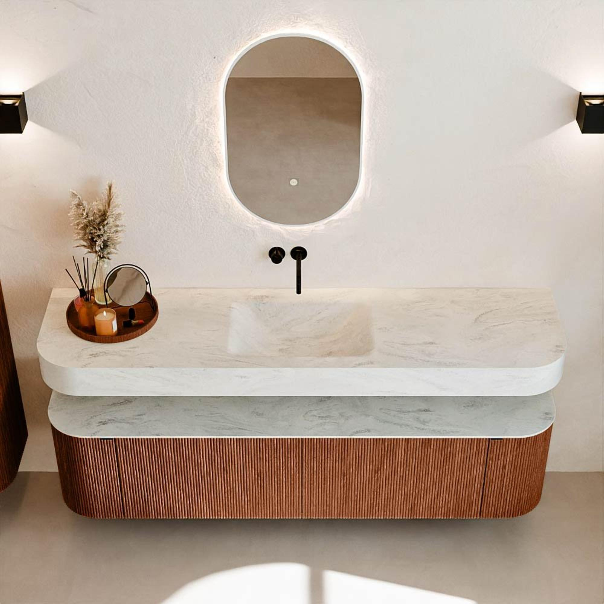 Boven het meubel zweeft een bijpassende, vrij hangende wastafel met afgeronde hoeken – perfect afgestemd op de vorm van de kast. De wastafel is uitgevoerd in Solid Surface en volgt subtiel de lijnen van het onderliggende meubel, waardoor een harmonieus geheel ontstaat. Het Solid Surface topblad vormt een sterke, onderhoudsvriendelijke basis en maakt de combinatie compleet.