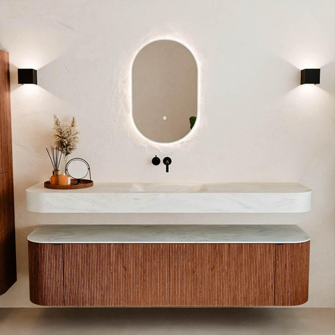 Natuurlijke materialen in warme tinten. De verticale ribbels brengen ritme en textuur in het ontwerp, terwijl het eikenhout zorgt voor een warme, ambachtelijke uitstraling. Kies uit 5 houttinten OAK, WALNUT, DUSK, SHADOW en RUBY zorgvuldig geselecteerde houtkleuren om zowel moderne als klassieke badkamers te verrijken.