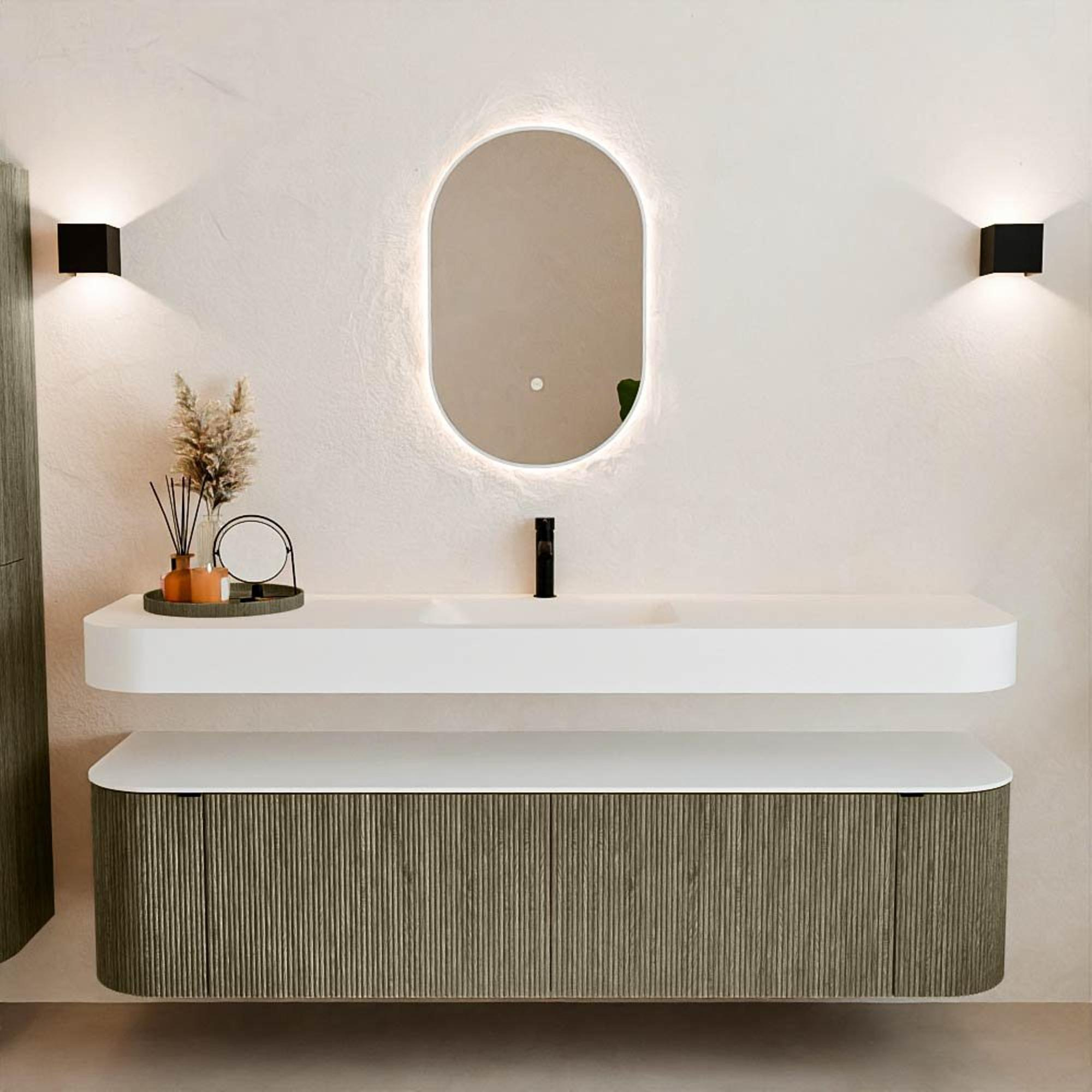 Boven het meubel zweeft een bijpassende, vrij hangende wastafel met afgeronde hoeken – perfect afgestemd op de vorm van de kast. De wastafel is uitgevoerd in Solid Surface en volgt subtiel de lijnen van het onderliggende meubel, waardoor een harmonieus geheel ontstaat. Het Solid Surface topblad vormt een sterke, onderhoudsvriendelijke basis en maakt de combinatie compleet.