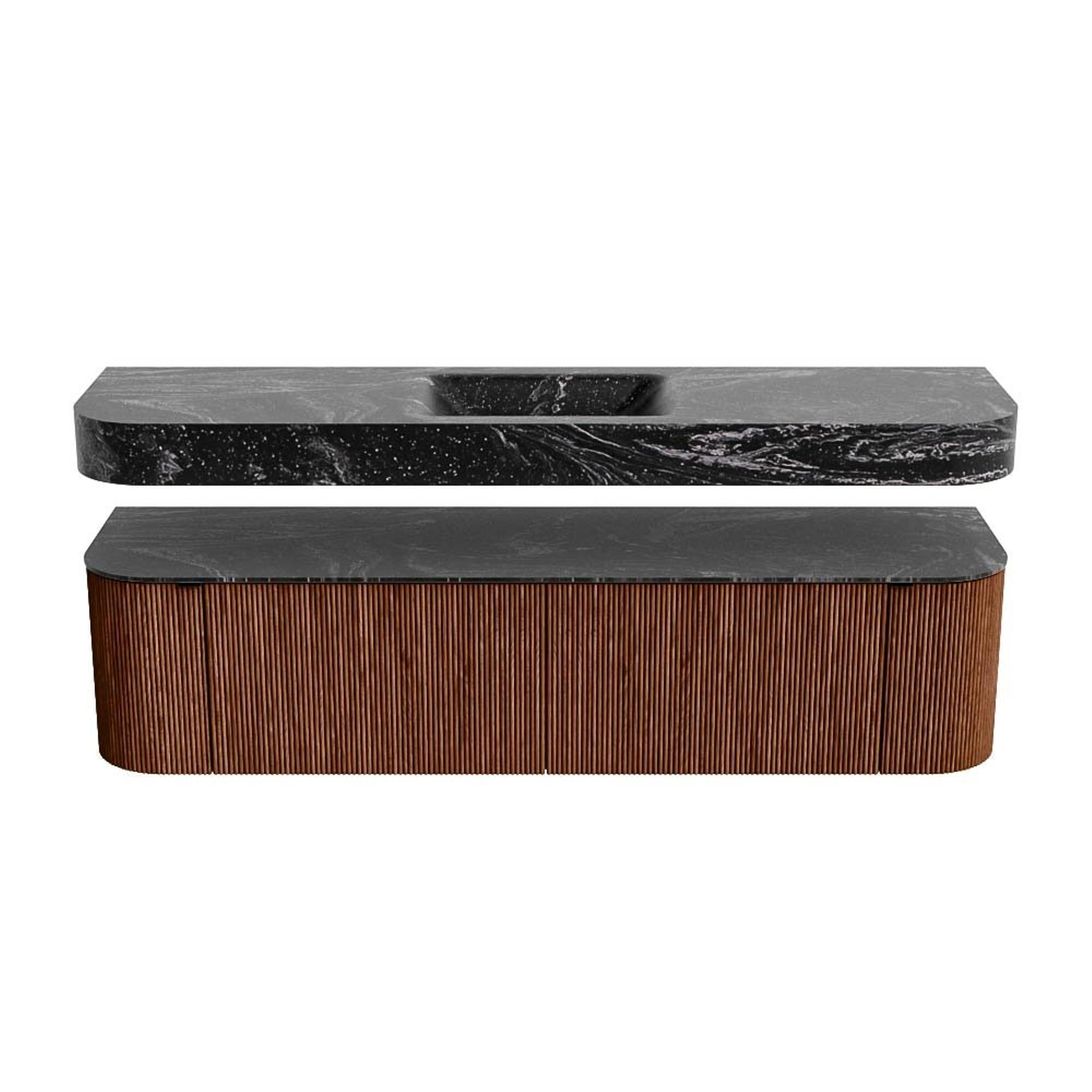 Boven het meubel zweeft een bijpassende, vrij hangende wastafel met afgeronde hoeken – perfect afgestemd op de vorm van de kast. De wastafel is uitgevoerd in Solid Surface en volgt subtiel de lijnen van het onderliggende meubel, waardoor een harmonieus geheel ontstaat. Het Solid Surface topblad vormt een sterke, onderhoudsvriendelijke basis en maakt de combinatie compleet.