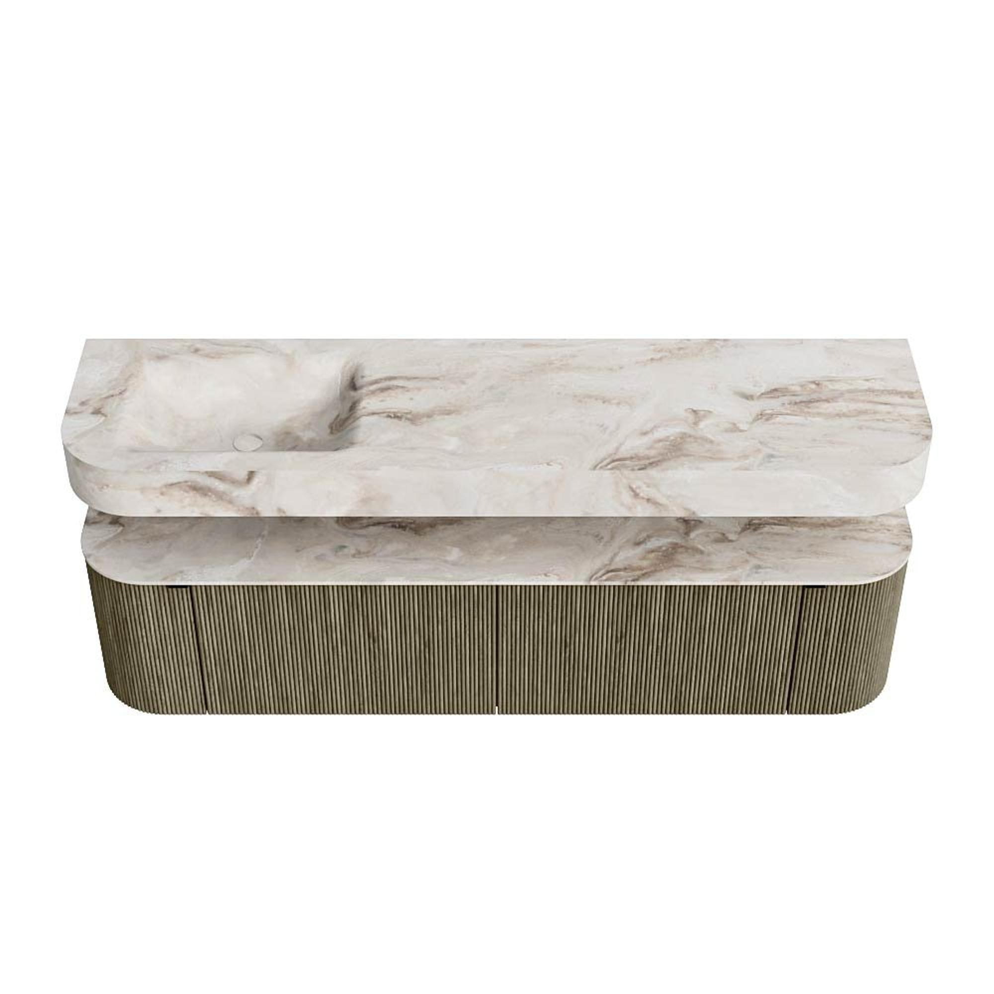 Boven het meubel zweeft een bijpassende, vrij hangende wastafel met afgeronde hoeken – perfect afgestemd op de vorm van de kast. De wastafel is uitgevoerd in Solid Surface en volgt subtiel de lijnen van het onderliggende meubel, waardoor een harmonieus geheel ontstaat. Het Solid Surface topblad vormt een sterke, onderhoudsvriendelijke basis en maakt de combinatie compleet.