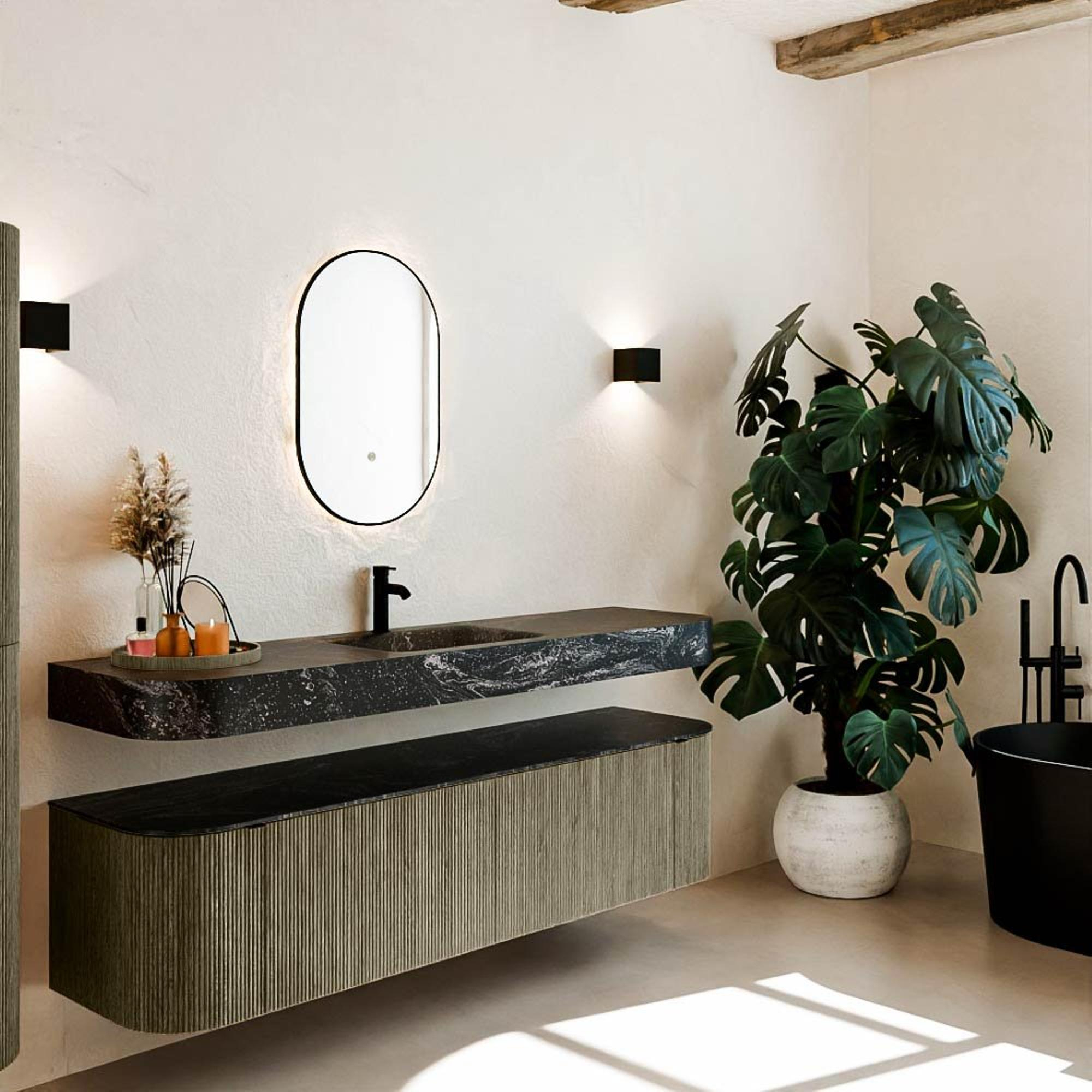 Natuurlijke materialen in warme tinten. De verticale ribbels brengen ritme en textuur in het ontwerp, terwijl het eikenhout zorgt voor een warme, ambachtelijke uitstraling. Kies uit 5 houttinten OAK, WALNUT, DUSK, SHADOW en RUBY zorgvuldig geselecteerde houtkleuren om zowel moderne als klassieke badkamers te verrijken.