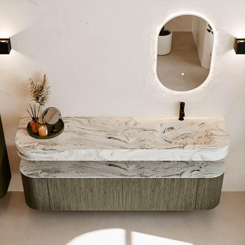 Boven het meubel zweeft een bijpassende, vrij hangende wastafel met afgeronde hoeken – perfect afgestemd op de vorm van de kast. De wastafel is uitgevoerd in Solid Surface en volgt subtiel de lijnen van het onderliggende meubel, waardoor een harmonieus geheel ontstaat. Het Solid Surface topblad vormt een sterke, onderhoudsvriendelijke basis en maakt de combinatie compleet.