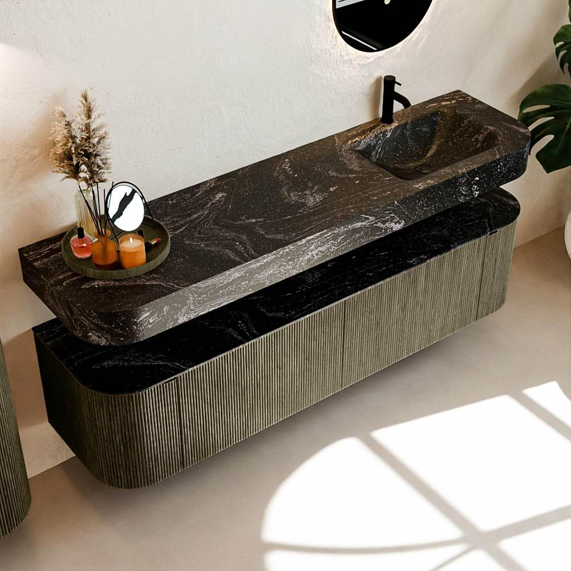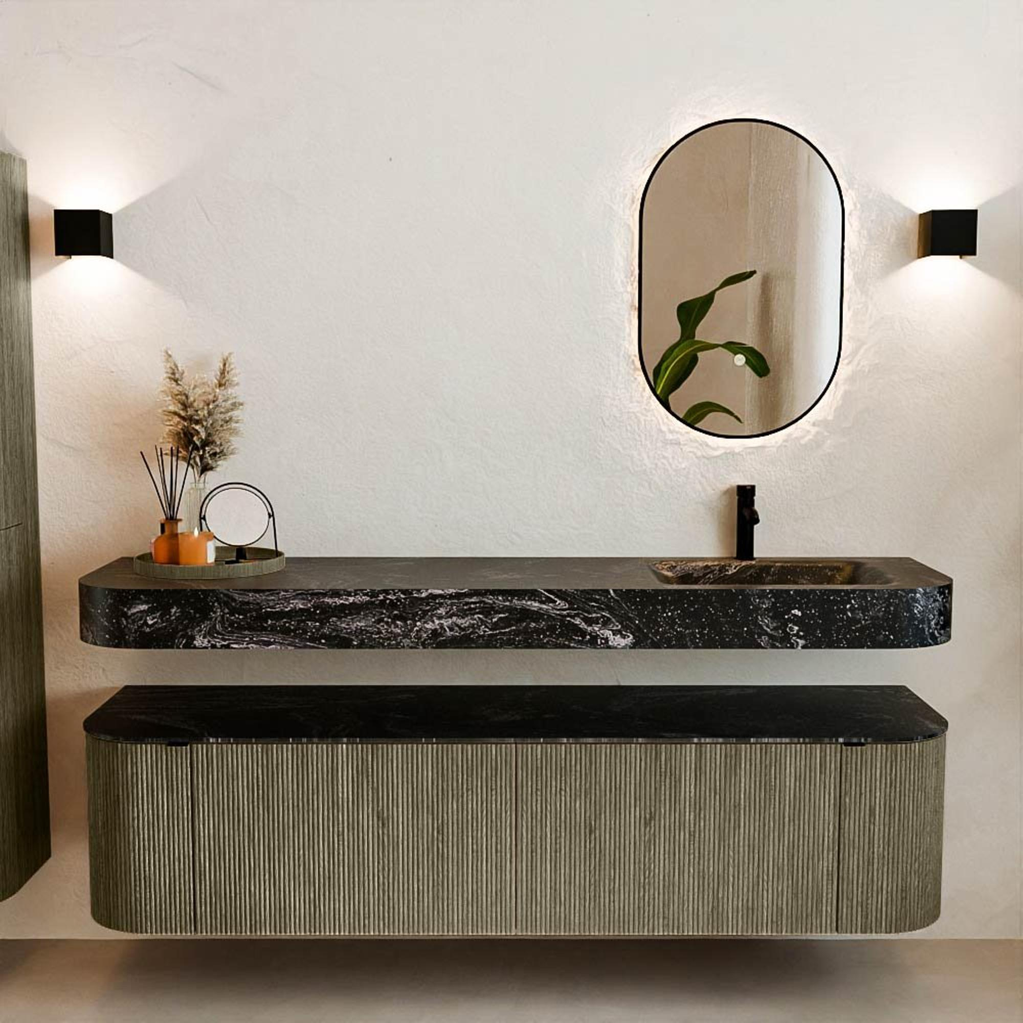 MONDIAZ THOR-DLUX 180cm badmeubel ronding links + rechts kleur Shadow met 2 lades en 2 deuren. Vrijhangende wastafel CLOUD Rechts 1 kraangat kleur Lava.