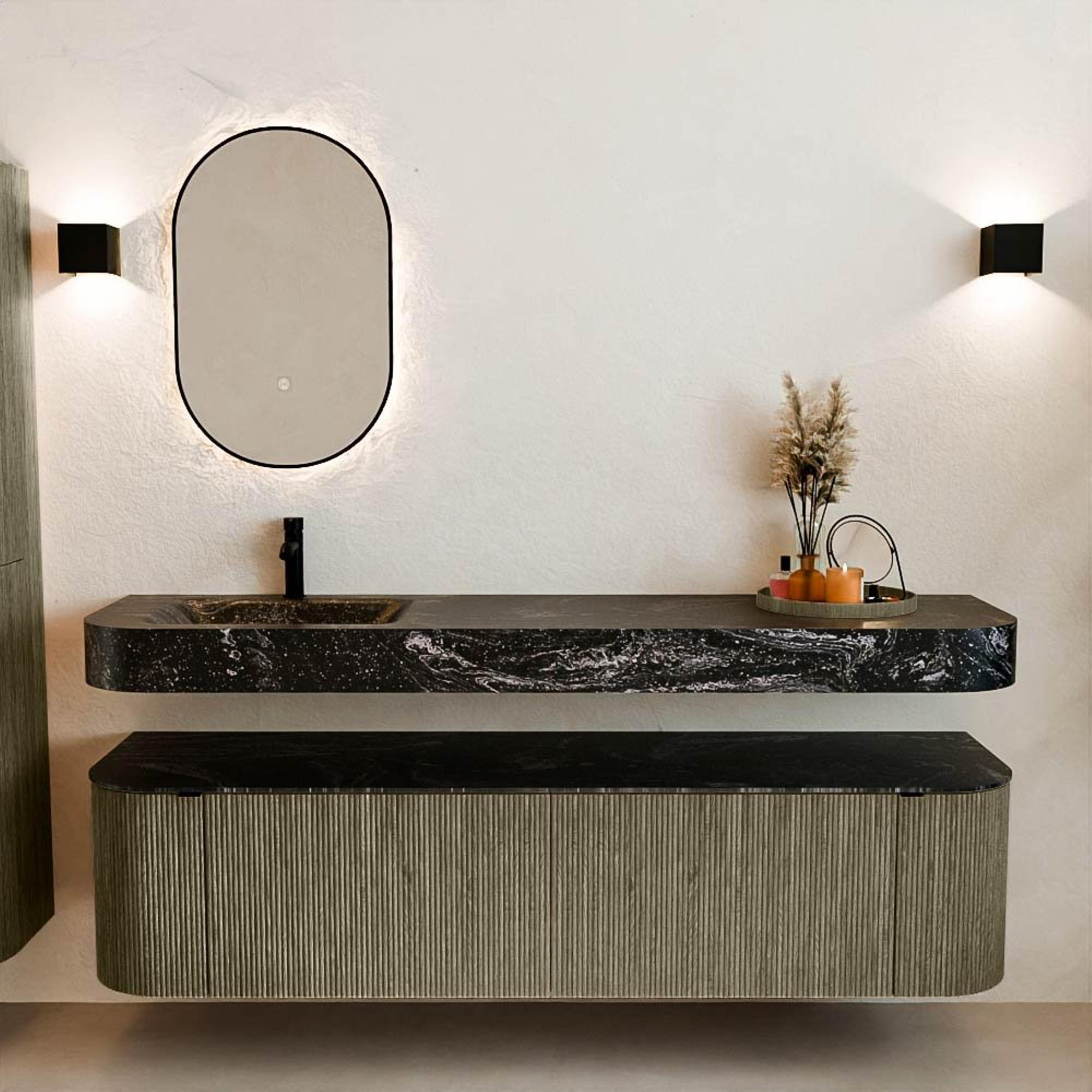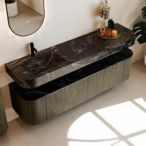 MONDIAZ THOR-DLUX 180cm badmeubel ronding links + rechts kleur Shadow met 2 lades en 2 deuren. Vrijhangende wastafel CLOUD Links 1 kraangat kleur Lava.