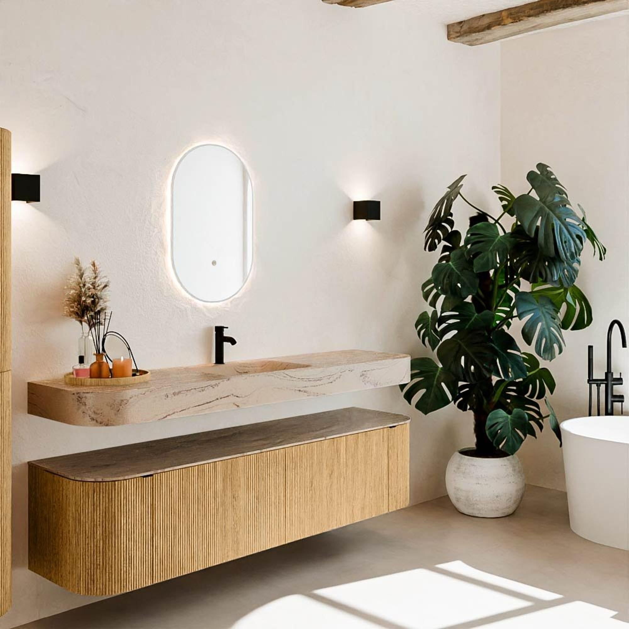 Natuurlijke materialen in warme tinten. De verticale ribbels brengen ritme en textuur in het ontwerp, terwijl het eikenhout zorgt voor een warme, ambachtelijke uitstraling. Kies uit 5 houttinten OAK, WALNUT, DUSK, SHADOW en RUBY zorgvuldig geselecteerde houtkleuren om zowel moderne als klassieke badkamers te verrijken.