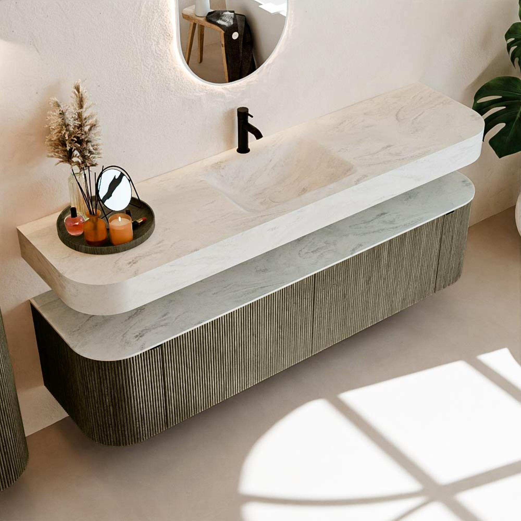 Boven het meubel zweeft een bijpassende, vrij hangende wastafel met afgeronde hoeken – perfect afgestemd op de vorm van de kast. De wastafel is uitgevoerd in Solid Surface en volgt subtiel de lijnen van het onderliggende meubel, waardoor een harmonieus geheel ontstaat. Het Solid Surface topblad vormt een sterke, onderhoudsvriendelijke basis en maakt de combinatie compleet.