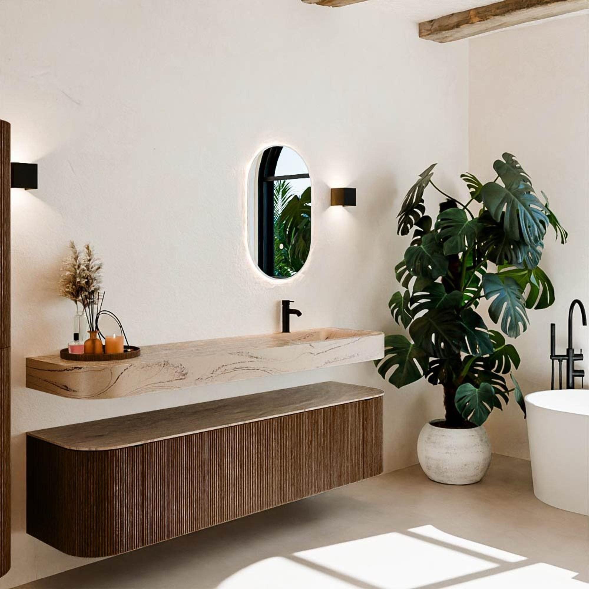 Natuurlijke materialen in warme tinten. De verticale ribbels brengen ritme en textuur in het ontwerp, terwijl het eikenhout zorgt voor een warme, ambachtelijke uitstraling. Kies uit 5 houttinten OAK, WALNUT, DUSK, SHADOW en RUBY zorgvuldig geselecteerde houtkleuren om zowel moderne als klassieke badkamers te verrijken.