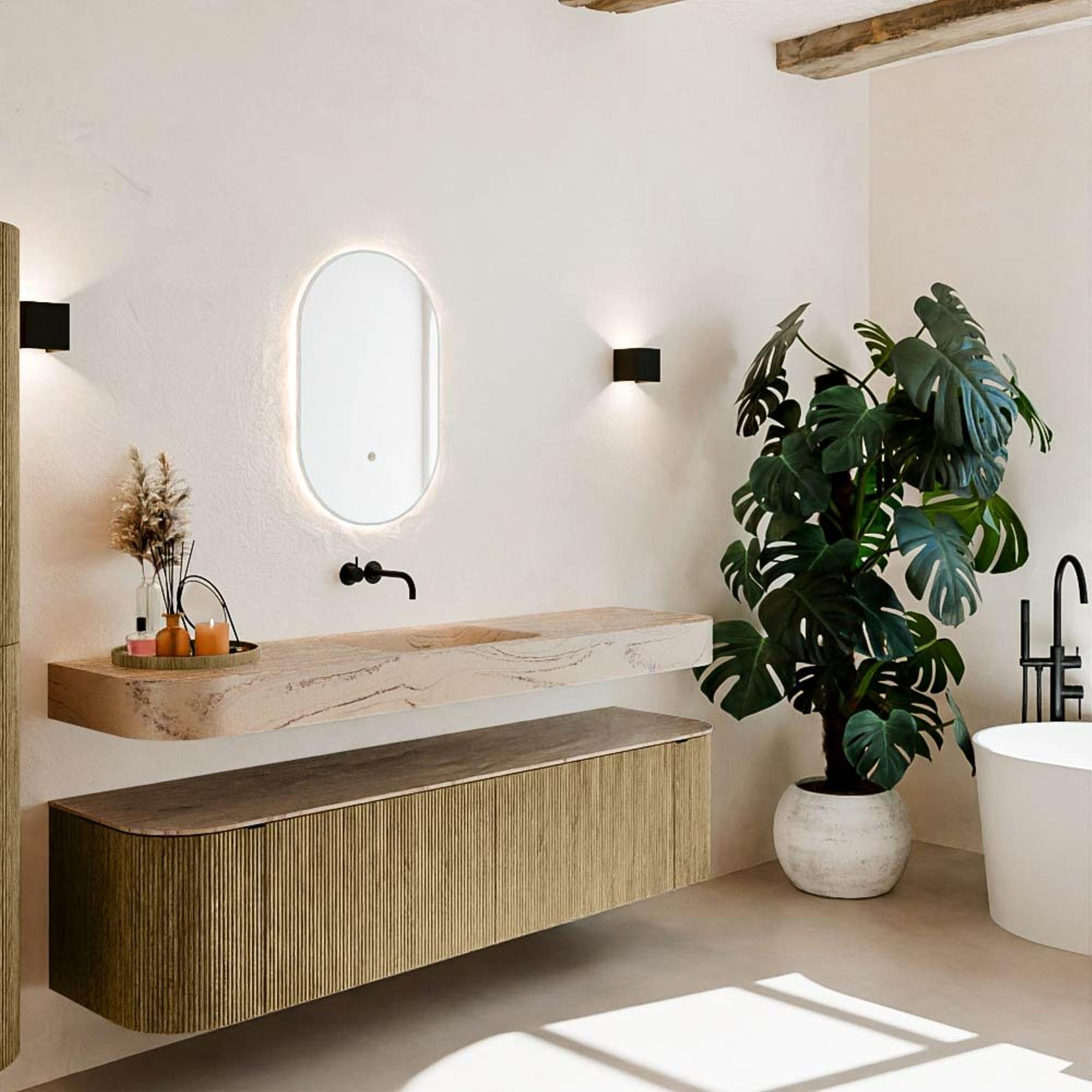 Natuurlijke materialen in warme tinten. De verticale ribbels brengen ritme en textuur in het ontwerp, terwijl het eikenhout zorgt voor een warme, ambachtelijke uitstraling. Kies uit 5 houttinten OAK, WALNUT, DUSK, SHADOW en RUBY zorgvuldig geselecteerde houtkleuren om zowel moderne als klassieke badkamers te verrijken.