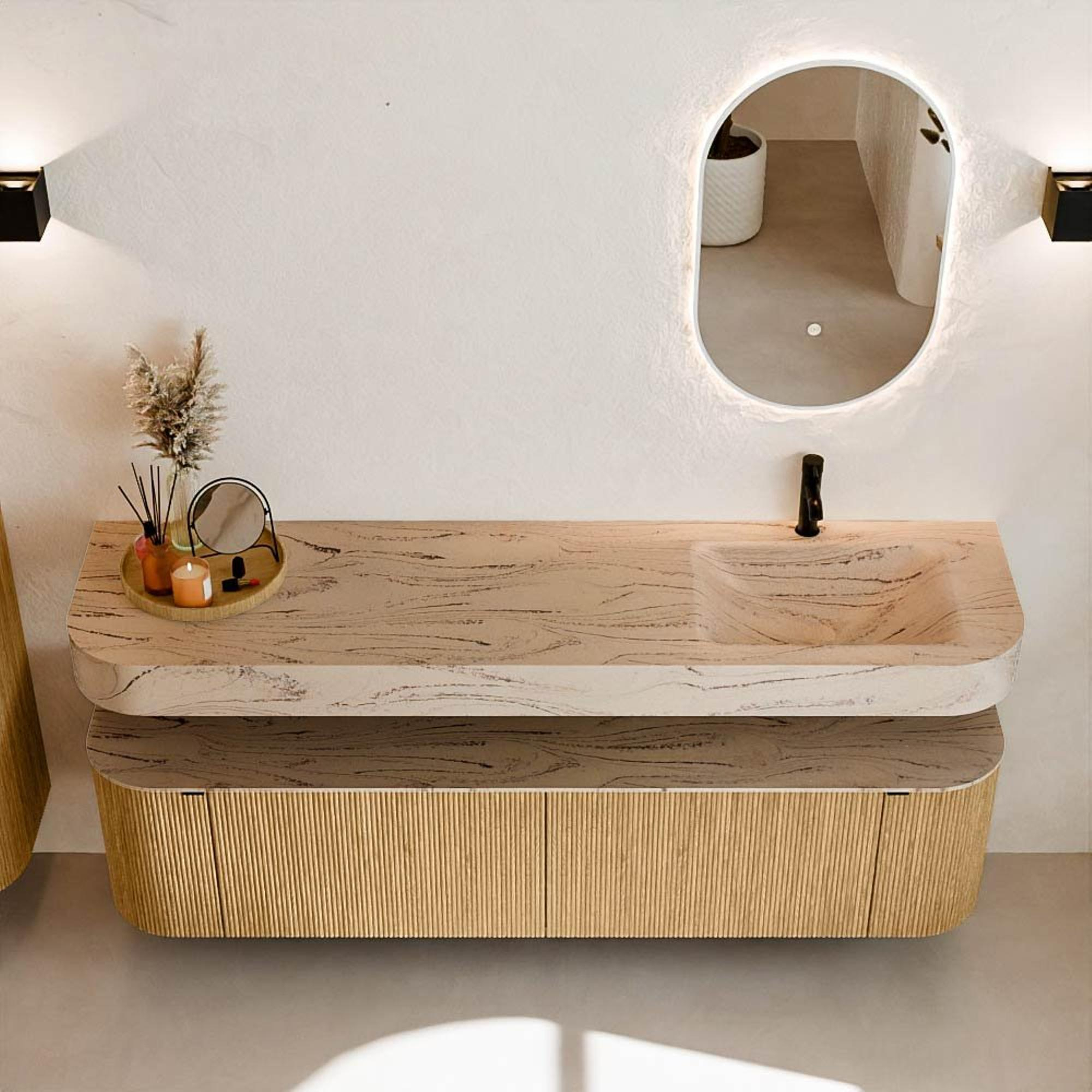 MONDIAZ THOR-DLUX 180cm badmeubel ronding links + rechts kleur Oak met 2 lades en 2 deuren. Vrijhangende wastafel CLOUD Rechts 1 kraangat kleur Arena.