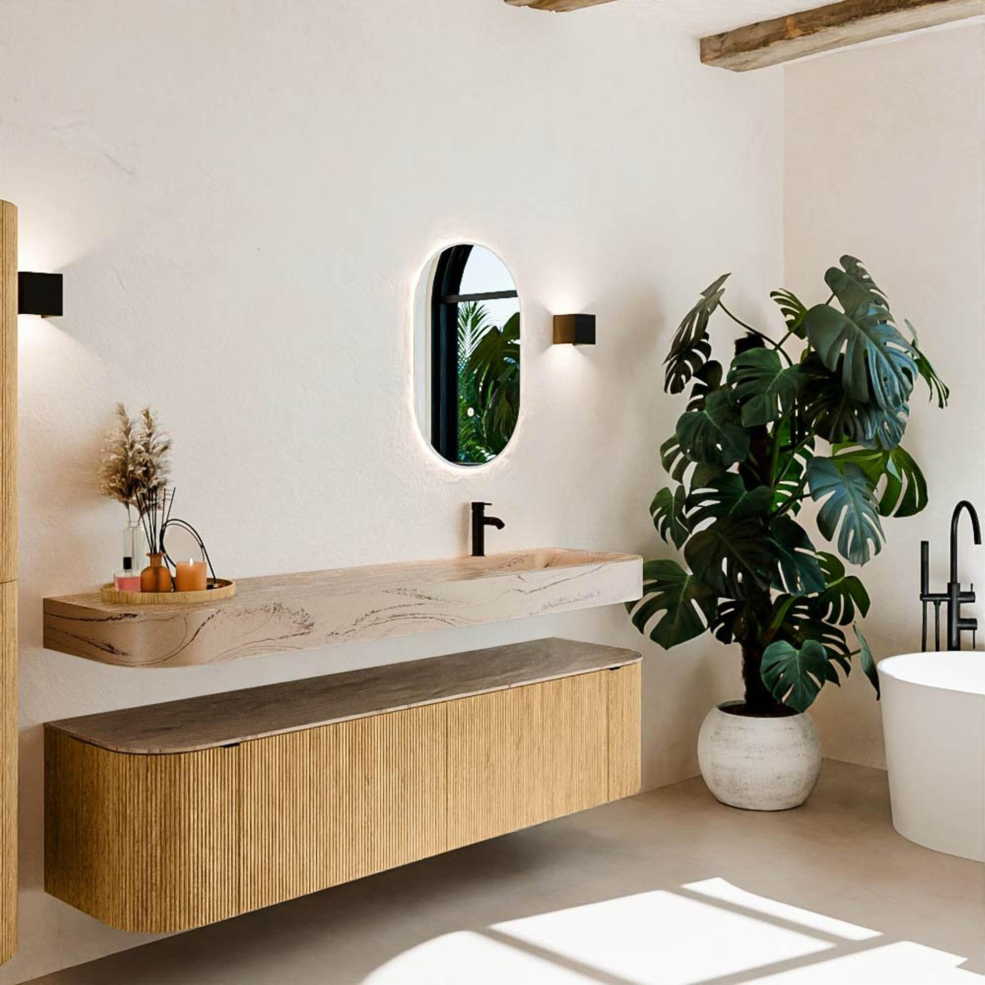 Natuurlijke materialen in warme tinten. De verticale ribbels brengen ritme en textuur in het ontwerp, terwijl het eikenhout zorgt voor een warme, ambachtelijke uitstraling. Kies uit 5 houttinten OAK, WALNUT, DUSK, SHADOW en RUBY zorgvuldig geselecteerde houtkleuren om zowel moderne als klassieke badkamers te verrijken.
