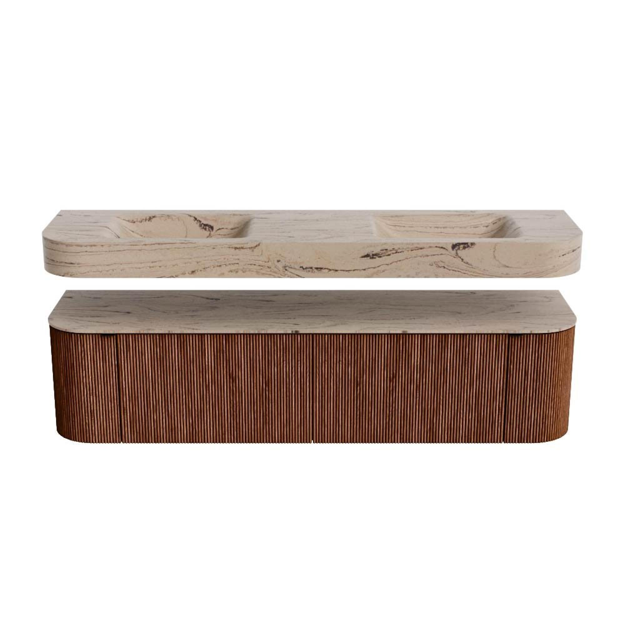 MONDIAZ THOR-DLUX 180cm badmeubel ronding links + rechts kleur Ruby met 2 lades en 2 deuren. Vrijhangende wastafel CLOUD Dubbel zonder kraangat kleur Arena.