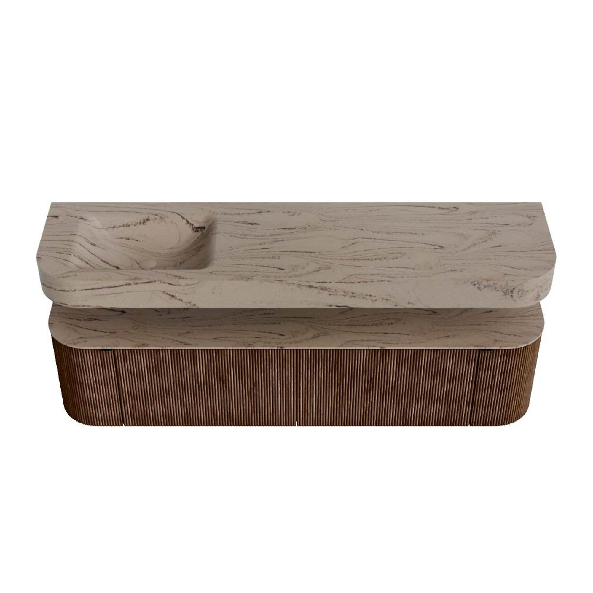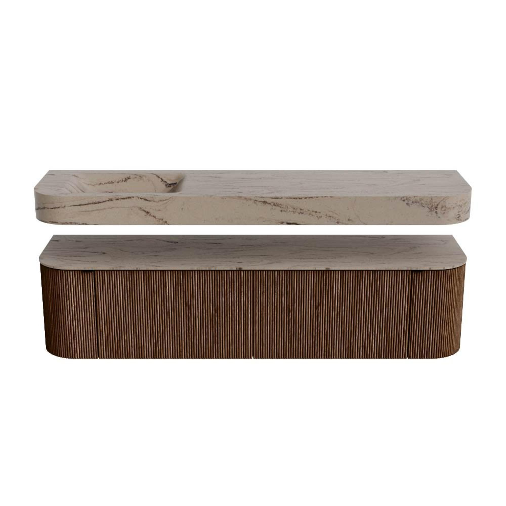 MONDIAZ THOR-DLUX 180cm badmeubel ronding links + rechts kleur Walnut met 2 lades en 2 deuren. Vrijhangende wastafel CLOUD Links 1 kraangat kleur Arena.