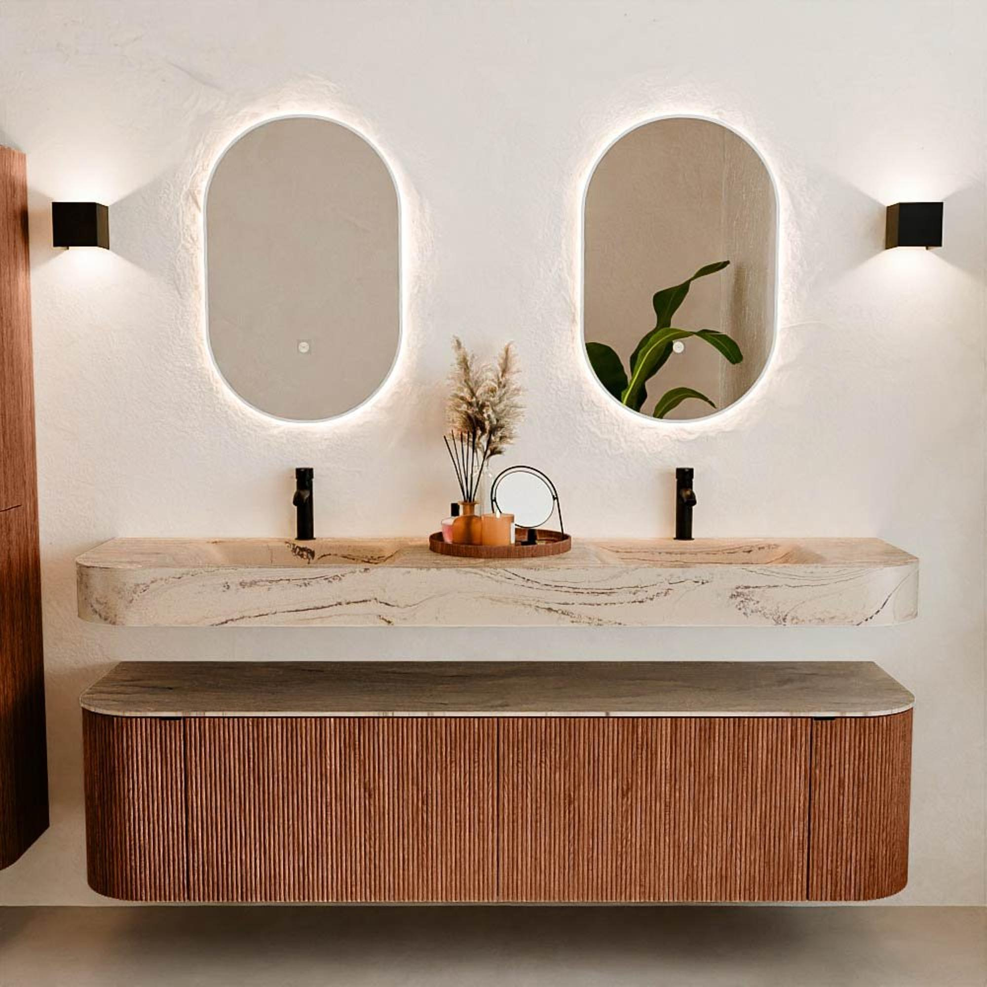 Natuurlijke materialen in warme tinten. De verticale ribbels brengen ritme en textuur in het ontwerp, terwijl het eikenhout zorgt voor een warme, ambachtelijke uitstraling. Kies uit 5 houttinten OAK, WALNUT, DUSK, SHADOW en RUBY zorgvuldig geselecteerde houtkleuren om zowel moderne als klassieke badkamers te verrijken.