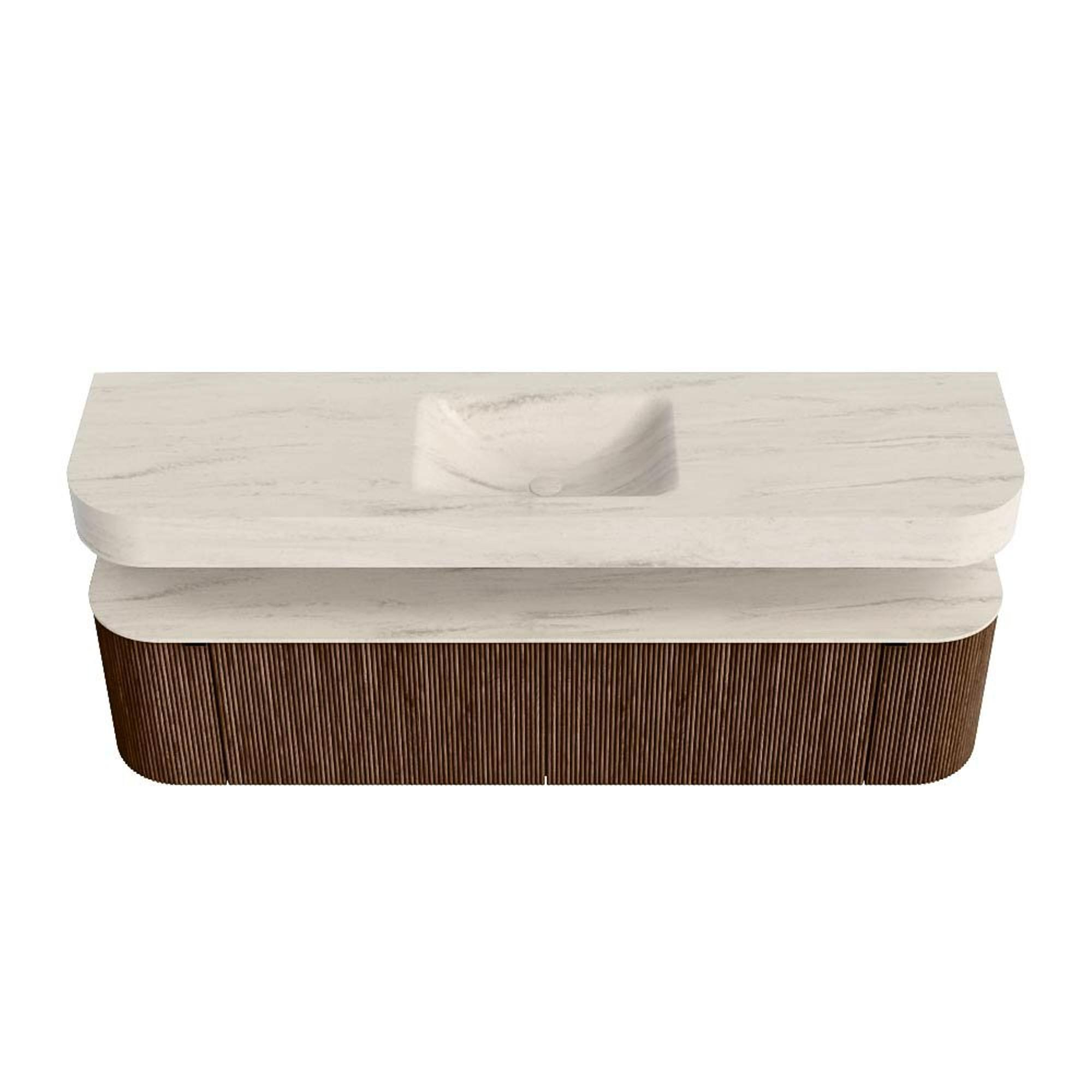 MONDIAZ THOR-DLUX 180cm badmeubel ronding links + rechts kleur Walnut met 2 lades en 2 deuren. Vrijhangende wastafel CLOUD Midden zonder kraangat kleur Meli.