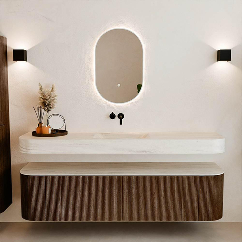 Boven het meubel zweeft een bijpassende, vrij hangende wastafel met afgeronde hoeken – perfect afgestemd op de vorm van de kast. De wastafel is uitgevoerd in Solid Surface en volgt subtiel de lijnen van het onderliggende meubel, waardoor een harmonieus geheel ontstaat. Het Solid Surface topblad vormt een sterke, onderhoudsvriendelijke basis en maakt de combinatie compleet.