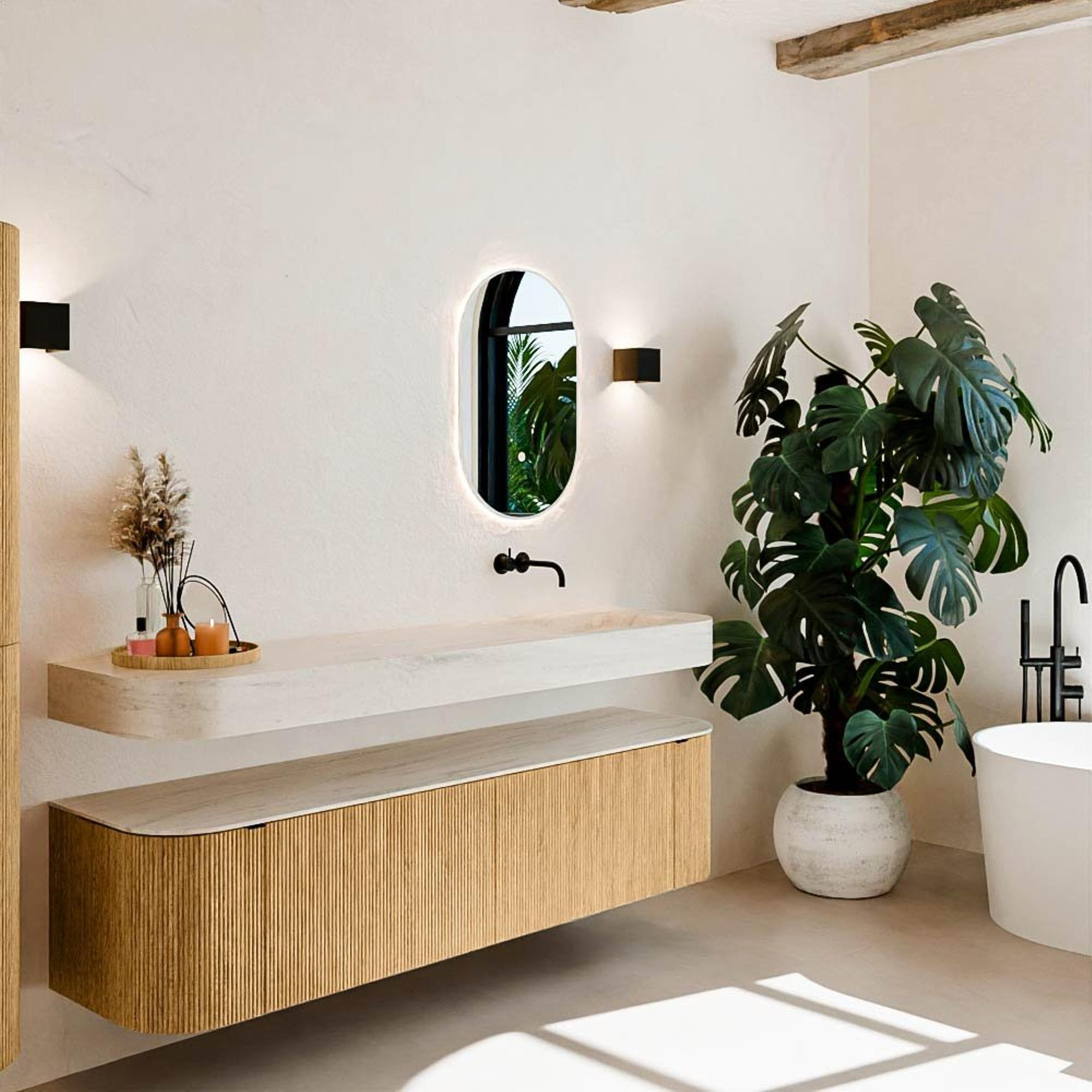 Natuurlijke materialen in warme tinten. De verticale ribbels brengen ritme en textuur in het ontwerp, terwijl het eikenhout zorgt voor een warme, ambachtelijke uitstraling. Kies uit 5 houttinten OAK, WALNUT, DUSK, SHADOW en RUBY zorgvuldig geselecteerde houtkleuren om zowel moderne als klassieke badkamers te verrijken.