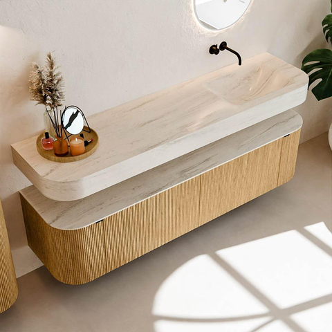 Boven het meubel zweeft een bijpassende, vrij hangende wastafel met afgeronde hoeken – perfect afgestemd op de vorm van de kast. De wastafel is uitgevoerd in Solid Surface en volgt subtiel de lijnen van het onderliggende meubel, waardoor een harmonieus geheel ontstaat. Het Solid Surface topblad vormt een sterke, onderhoudsvriendelijke basis en maakt de combinatie compleet.