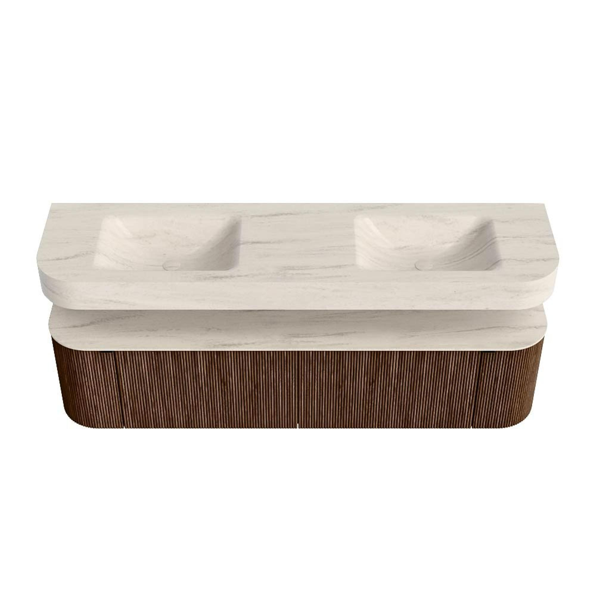 MONDIAZ THOR-DLUX 180cm badmeubel ronding links + rechts kleur Walnut met 2 lades en 2 deuren. Vrijhangende wastafel CLOUD Dubbel zonder kraangat kleur Meli.