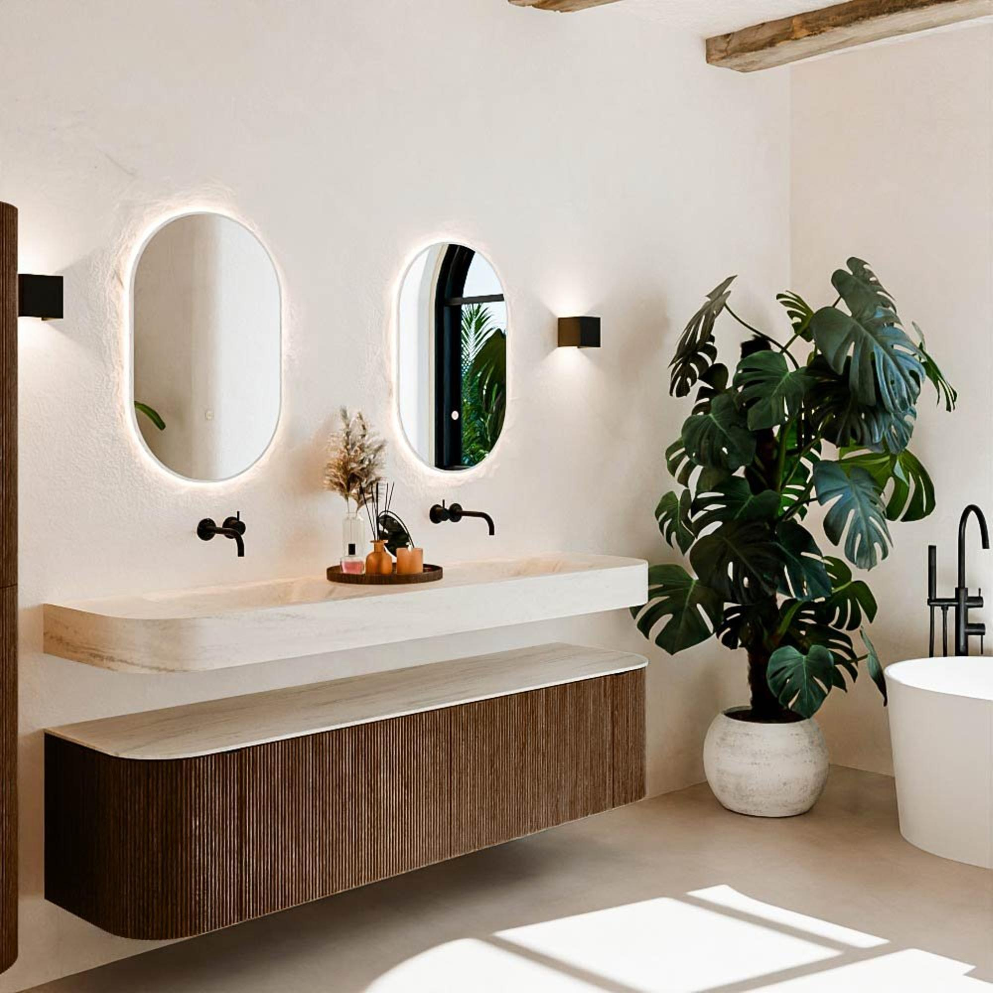 Natuurlijke materialen in warme tinten. De verticale ribbels brengen ritme en textuur in het ontwerp, terwijl het eikenhout zorgt voor een warme, ambachtelijke uitstraling. Kies uit 5 houttinten OAK, WALNUT, DUSK, SHADOW en RUBY zorgvuldig geselecteerde houtkleuren om zowel moderne als klassieke badkamers te verrijken.