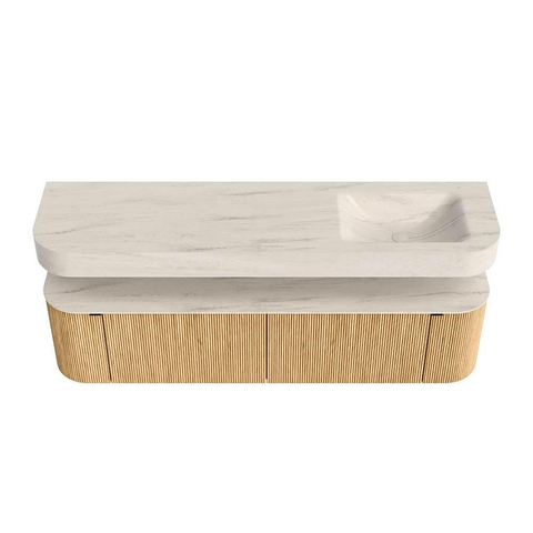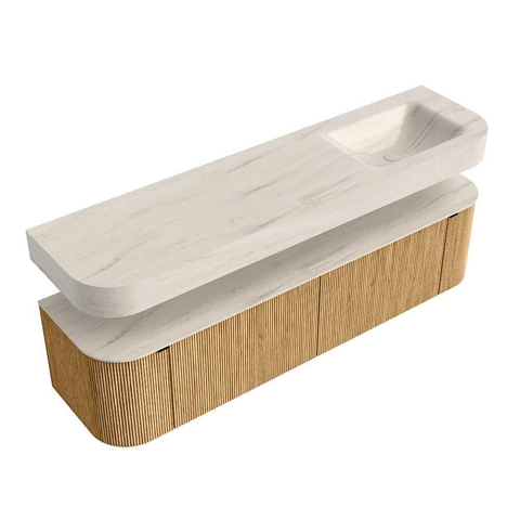 MONDIAZ THOR-DLUX 180cm badmeubel ronding links + rechts kleur Oak met 2 lades en 2 deuren. Vrijhangende wastafel CLOUD Rechts 1 kraangat kleur Meli.