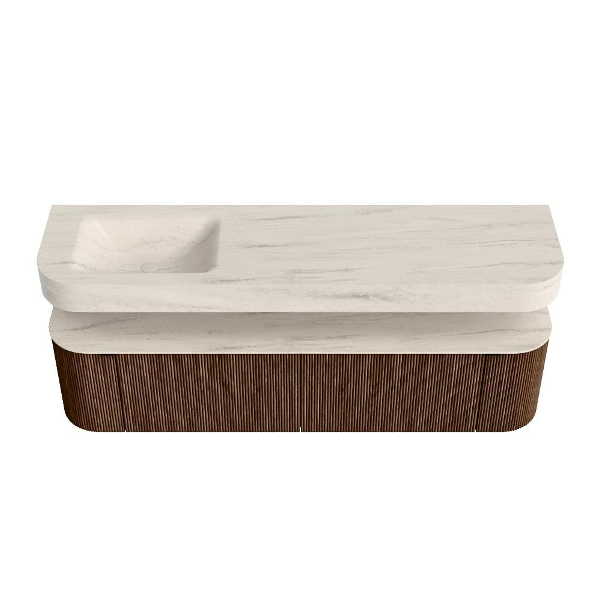 MONDIAZ THOR-DLUX 180cm badmeubel ronding links + rechts kleur Walnut met 2 lades en 2 deuren. Vrijhangende wastafel CLOUD Links 1 kraangat kleur Meli.