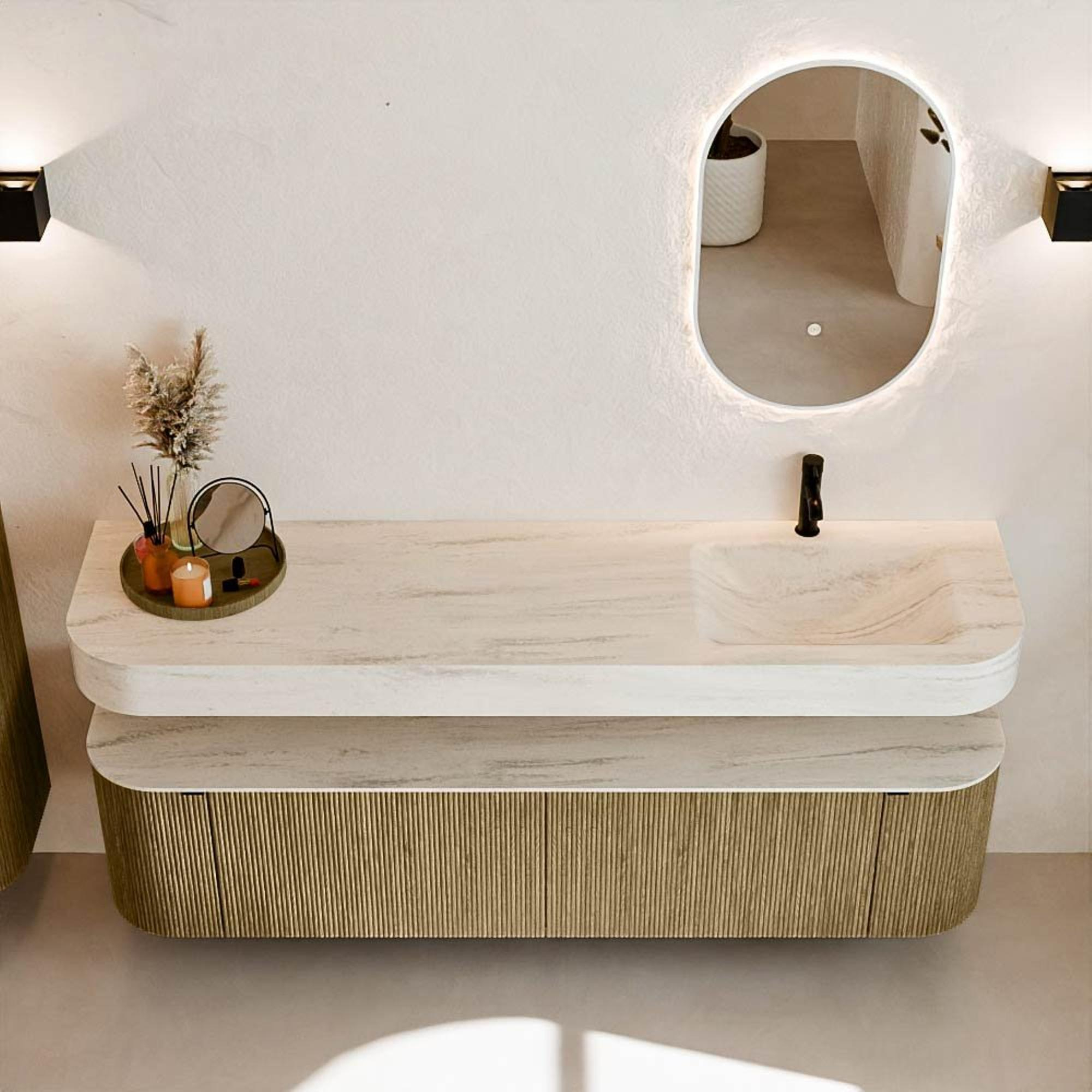 Boven het meubel zweeft een bijpassende, vrij hangende wastafel met afgeronde hoeken – perfect afgestemd op de vorm van de kast. De wastafel is uitgevoerd in Solid Surface en volgt subtiel de lijnen van het onderliggende meubel, waardoor een harmonieus geheel ontstaat. Het Solid Surface topblad vormt een sterke, onderhoudsvriendelijke basis en maakt de combinatie compleet.