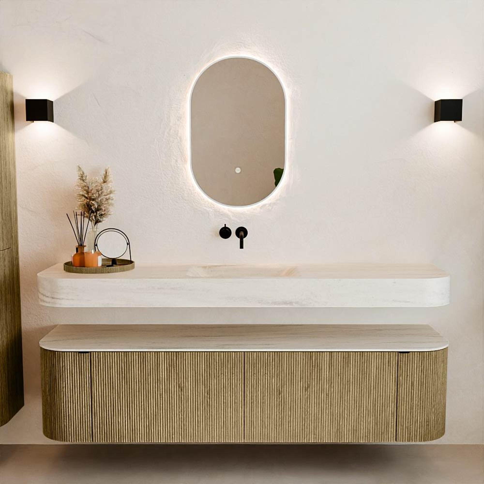Natuurlijke materialen in warme tinten. De verticale ribbels brengen ritme en textuur in het ontwerp, terwijl het eikenhout zorgt voor een warme, ambachtelijke uitstraling. Kies uit 5 houttinten OAK, WALNUT, DUSK, SHADOW en RUBY zorgvuldig geselecteerde houtkleuren om zowel moderne als klassieke badkamers te verrijken.