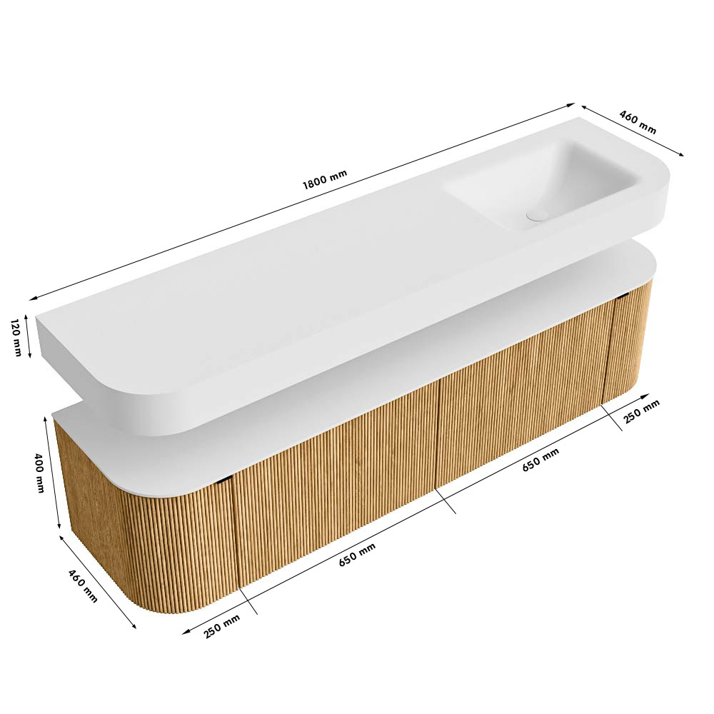 Boven het meubel zweeft een bijpassende, vrij hangende wastafel met afgeronde hoeken – perfect afgestemd op de vorm van de kast. De wastafel is uitgevoerd in Solid Surface en volgt subtiel de lijnen van het onderliggende meubel, waardoor een harmonieus geheel ontstaat. Het Solid Surface topblad vormt een sterke, onderhoudsvriendelijke basis en maakt de combinatie compleet.