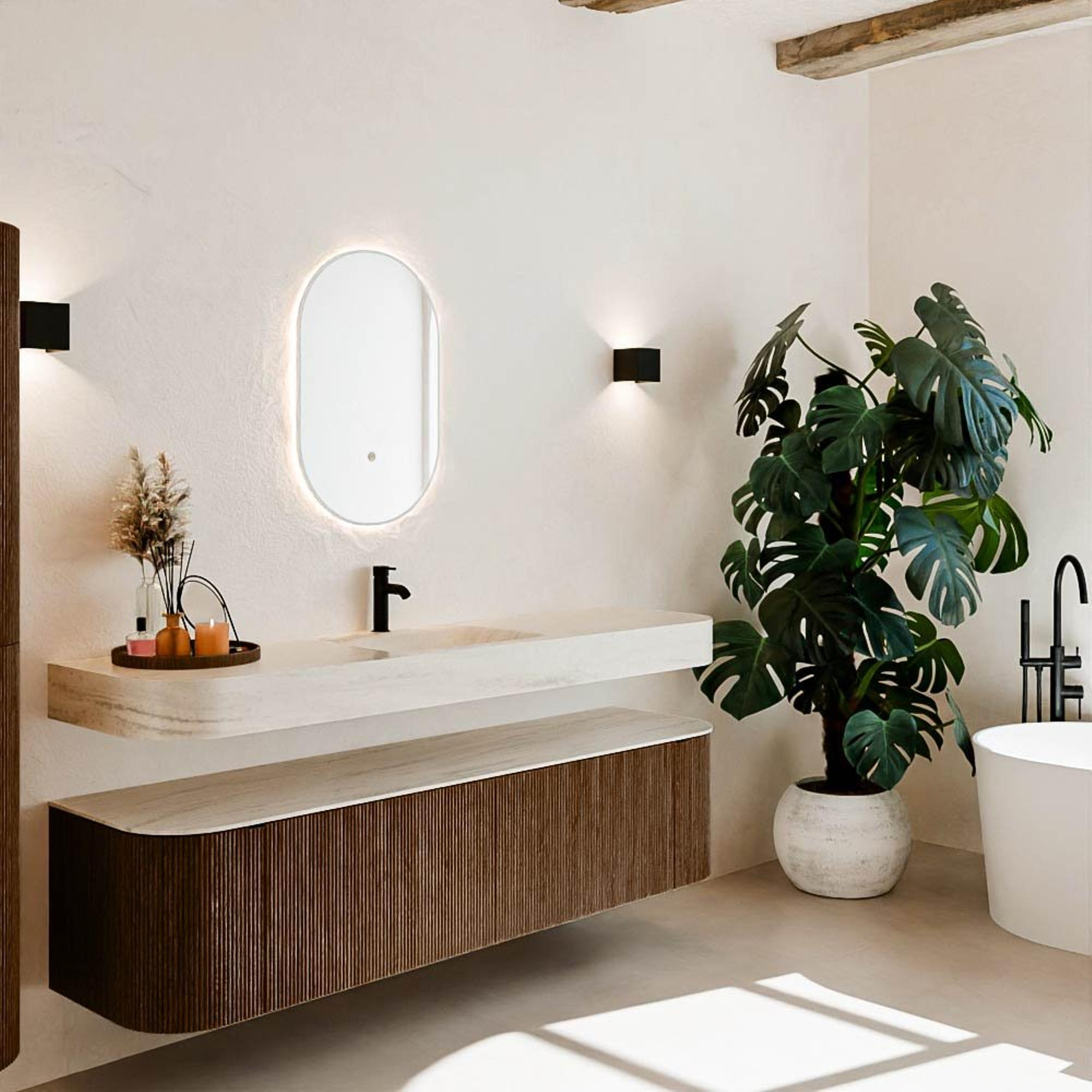 Natuurlijke materialen in warme tinten. De verticale ribbels brengen ritme en textuur in het ontwerp, terwijl het eikenhout zorgt voor een warme, ambachtelijke uitstraling. Kies uit 5 houttinten OAK, WALNUT, DUSK, SHADOW en RUBY zorgvuldig geselecteerde houtkleuren om zowel moderne als klassieke badkamers te verrijken.