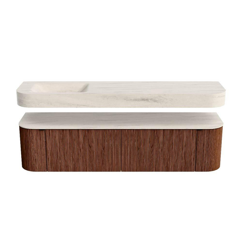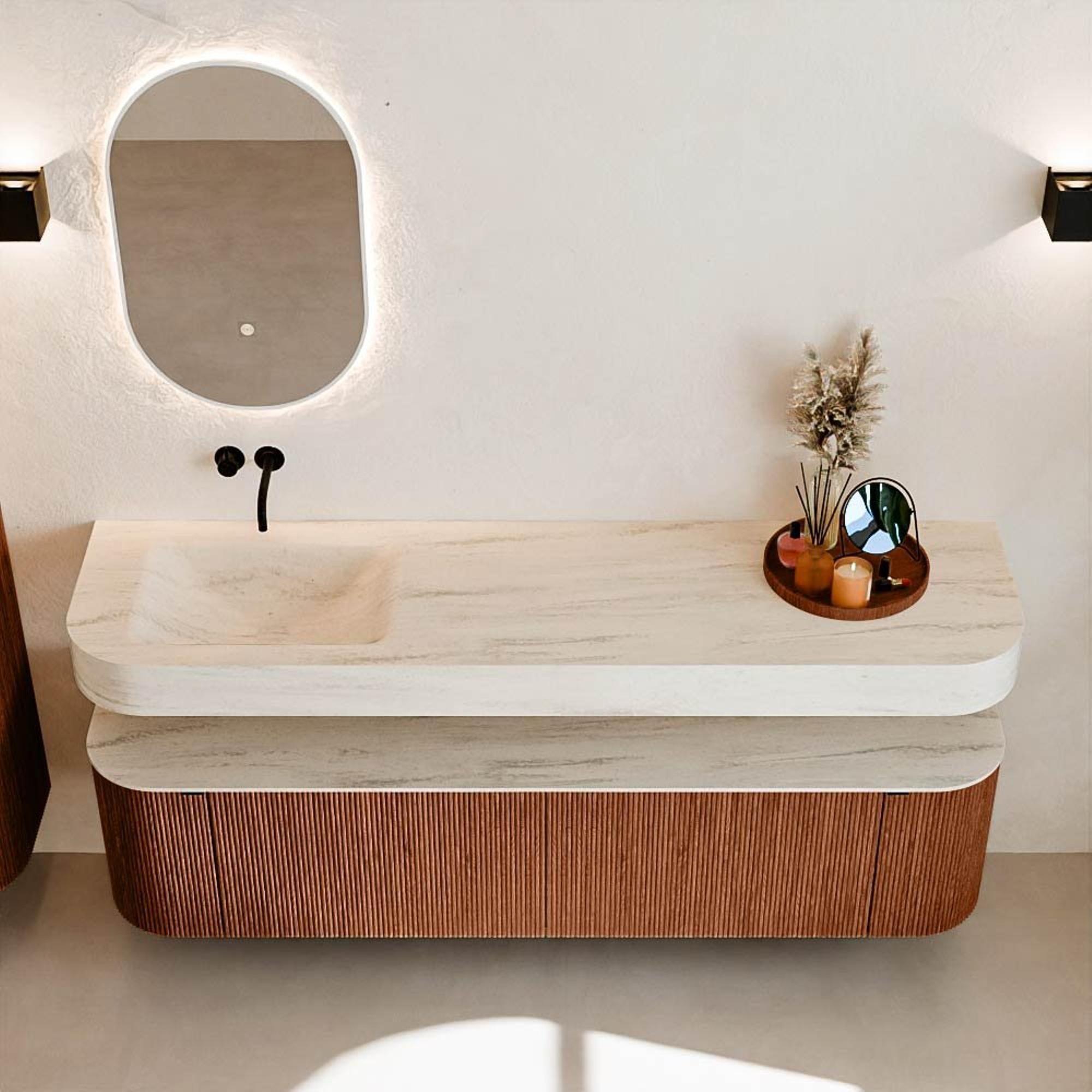 Boven het meubel zweeft een bijpassende, vrij hangende wastafel met afgeronde hoeken – perfect afgestemd op de vorm van de kast. De wastafel is uitgevoerd in Solid Surface en volgt subtiel de lijnen van het onderliggende meubel, waardoor een harmonieus geheel ontstaat. Het Solid Surface topblad vormt een sterke, onderhoudsvriendelijke basis en maakt de combinatie compleet.