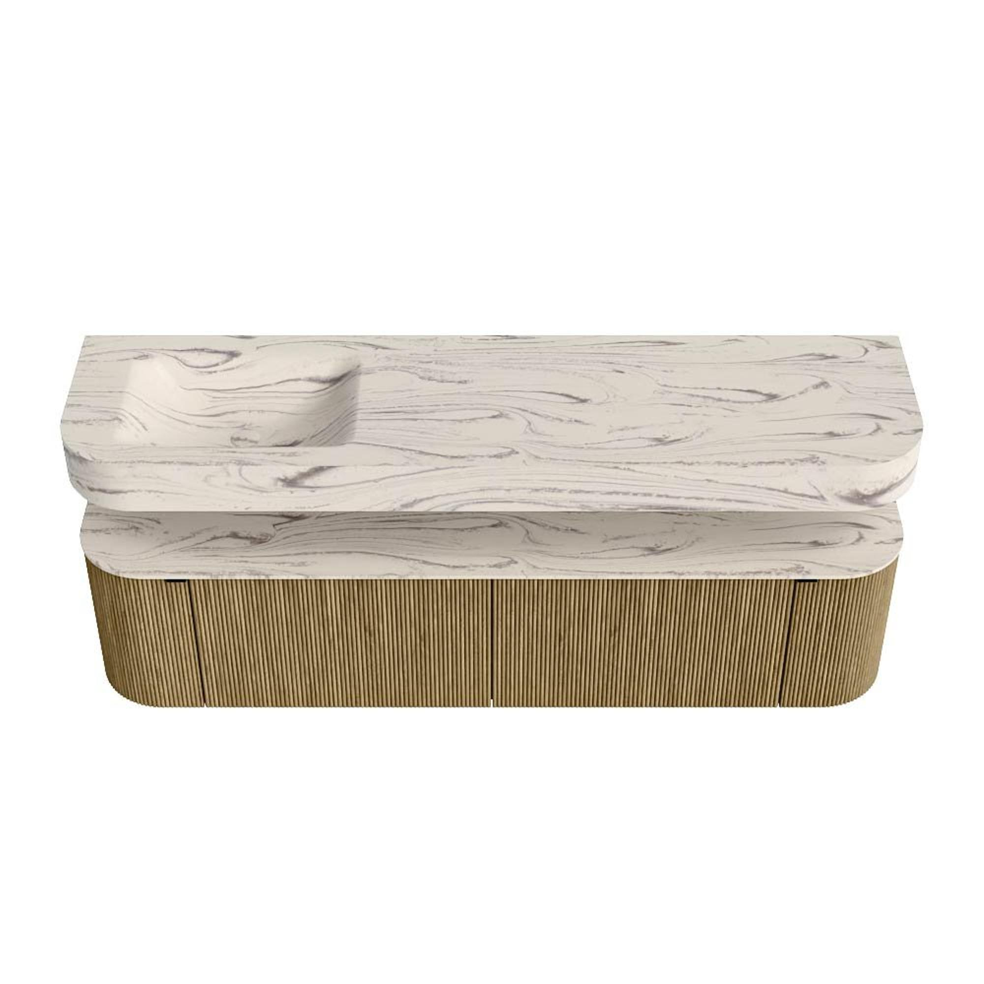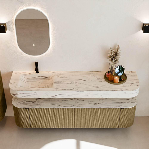 MONDIAZ THOR-DLUX 180cm badmeubel ronding links + rechts kleur Dusk met 2 lades en 2 deuren. Vrijhangende wastafel CLOUD Links 1 kraangat kleur Nata.