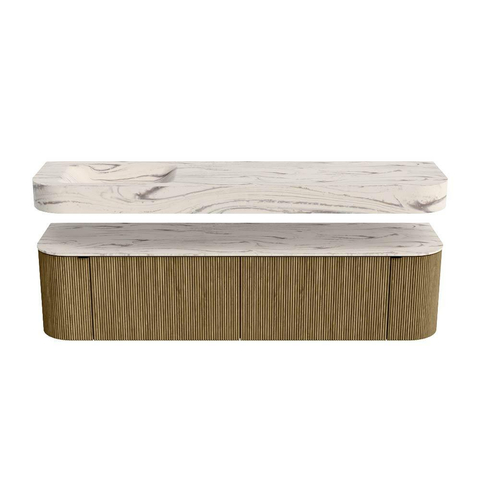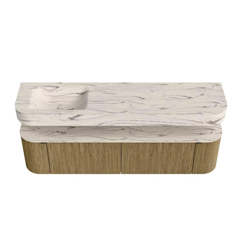 Boven het meubel zweeft een bijpassende, vrij hangende wastafel met afgeronde hoeken – perfect afgestemd op de vorm van de kast. De wastafel is uitgevoerd in Solid Surface en volgt subtiel de lijnen van het onderliggende meubel, waardoor een harmonieus geheel ontstaat. Het Solid Surface topblad vormt een sterke, onderhoudsvriendelijke basis en maakt de combinatie compleet.