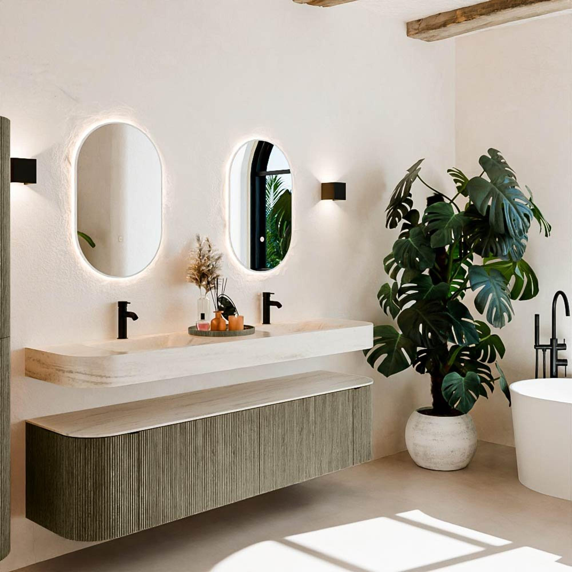 Natuurlijke materialen in warme tinten. De verticale ribbels brengen ritme en textuur in het ontwerp, terwijl het eikenhout zorgt voor een warme, ambachtelijke uitstraling. Kies uit 5 houttinten OAK, WALNUT, DUSK, SHADOW en RUBY zorgvuldig geselecteerde houtkleuren om zowel moderne als klassieke badkamers te verrijken.