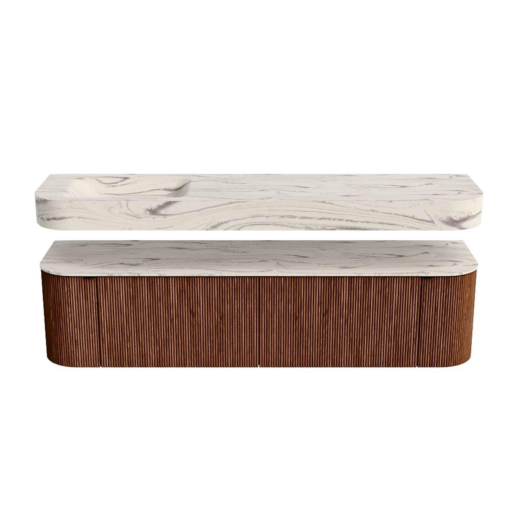 Boven het meubel zweeft een bijpassende, vrij hangende wastafel met afgeronde hoeken – perfect afgestemd op de vorm van de kast. De wastafel is uitgevoerd in Solid Surface en volgt subtiel de lijnen van het onderliggende meubel, waardoor een harmonieus geheel ontstaat. Het Solid Surface topblad vormt een sterke, onderhoudsvriendelijke basis en maakt de combinatie compleet.
