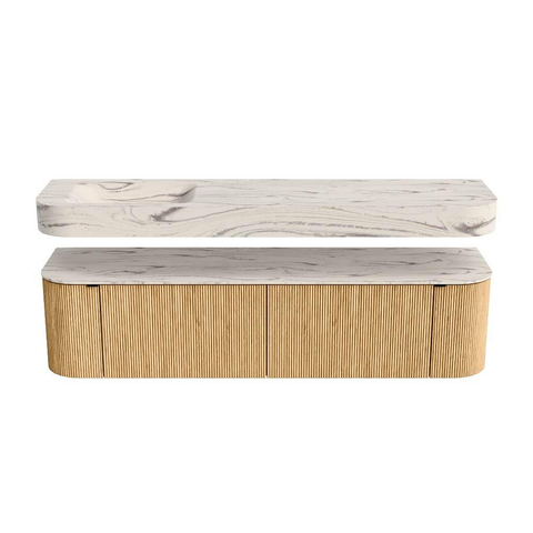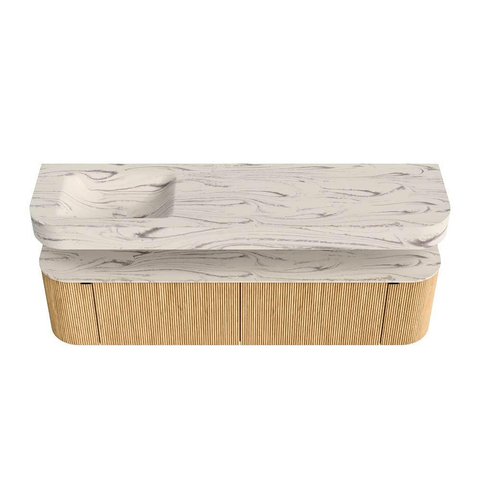 MONDIAZ THOR-DLUX 180cm badmeubel ronding links + rechts kleur Oak met 2 lades en 2 deuren. Vrijhangende wastafel CLOUD Links 1 kraangat kleur Nata.