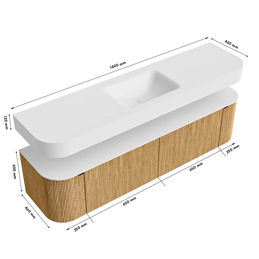 Boven het meubel zweeft een bijpassende, vrij hangende wastafel met afgeronde hoeken – perfect afgestemd op de vorm van de kast. De wastafel is uitgevoerd in Solid Surface en volgt subtiel de lijnen van het onderliggende meubel, waardoor een harmonieus geheel ontstaat. Het Solid Surface topblad vormt een sterke, onderhoudsvriendelijke basis en maakt de combinatie compleet.