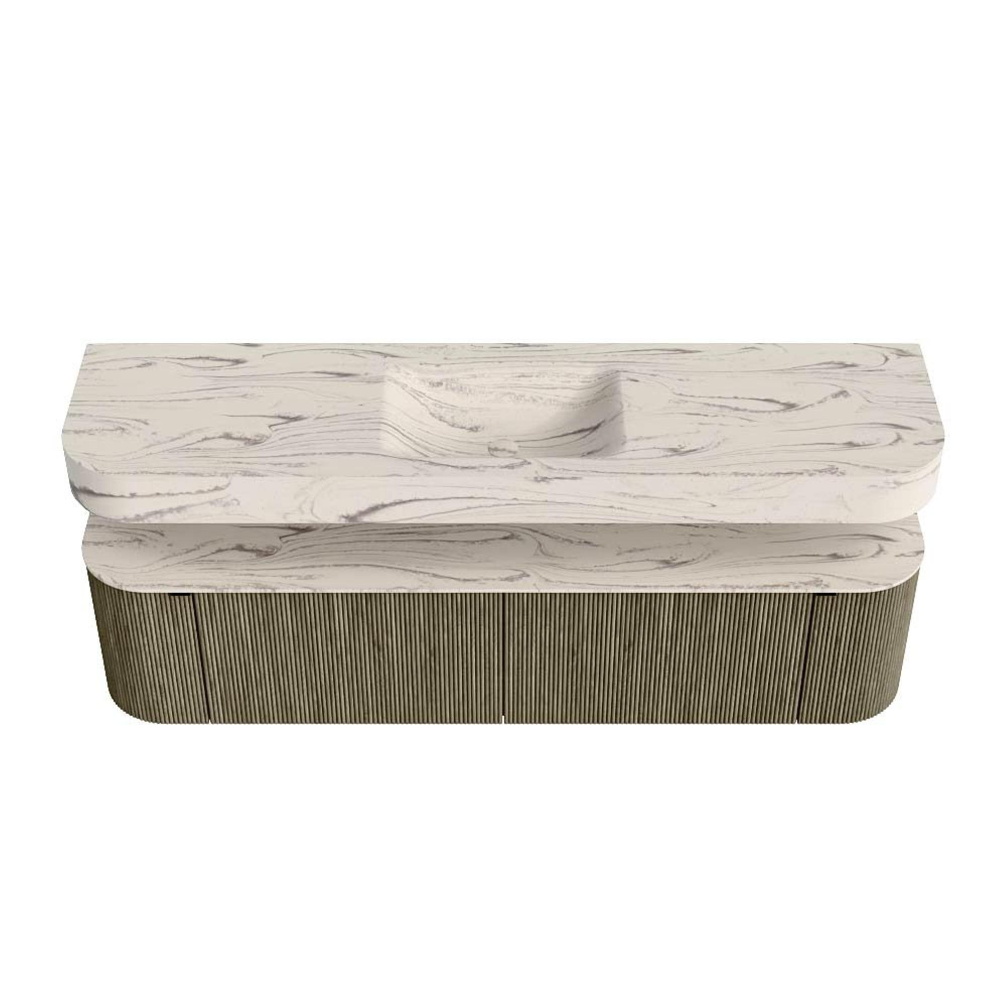 Boven het meubel zweeft een bijpassende, vrij hangende wastafel met afgeronde hoeken – perfect afgestemd op de vorm van de kast. De wastafel is uitgevoerd in Solid Surface en volgt subtiel de lijnen van het onderliggende meubel, waardoor een harmonieus geheel ontstaat. Het Solid Surface topblad vormt een sterke, onderhoudsvriendelijke basis en maakt de combinatie compleet.