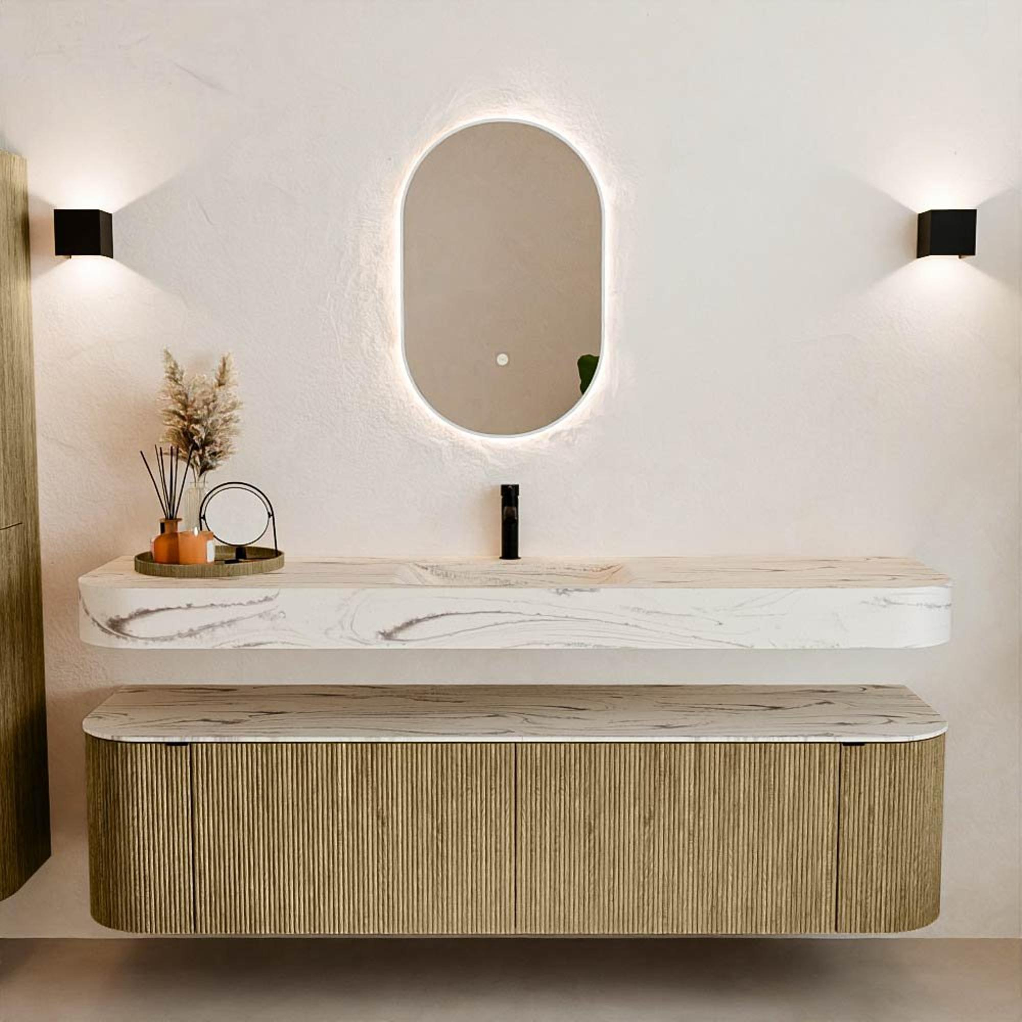 Natuurlijke materialen in warme tinten. De verticale ribbels brengen ritme en textuur in het ontwerp, terwijl het eikenhout zorgt voor een warme, ambachtelijke uitstraling. Kies uit 5 houttinten OAK, WALNUT, DUSK, SHADOW en RUBY zorgvuldig geselecteerde houtkleuren om zowel moderne als klassieke badkamers te verrijken.