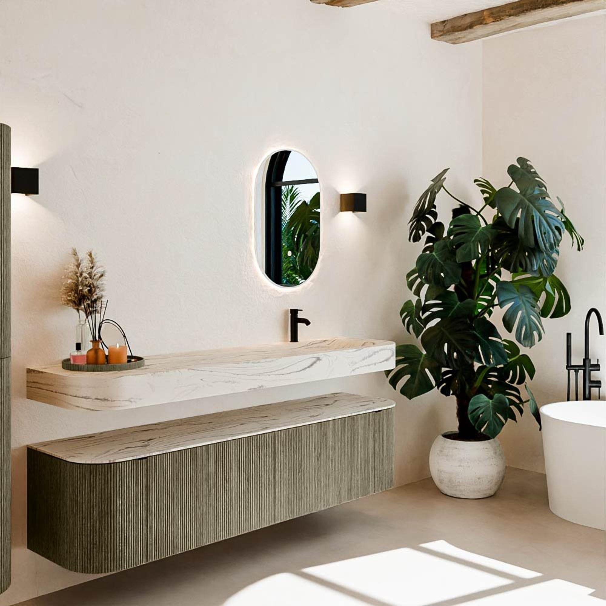 Natuurlijke materialen in warme tinten. De verticale ribbels brengen ritme en textuur in het ontwerp, terwijl het eikenhout zorgt voor een warme, ambachtelijke uitstraling. Kies uit 5 houttinten OAK, WALNUT, DUSK, SHADOW en RUBY zorgvuldig geselecteerde houtkleuren om zowel moderne als klassieke badkamers te verrijken.
