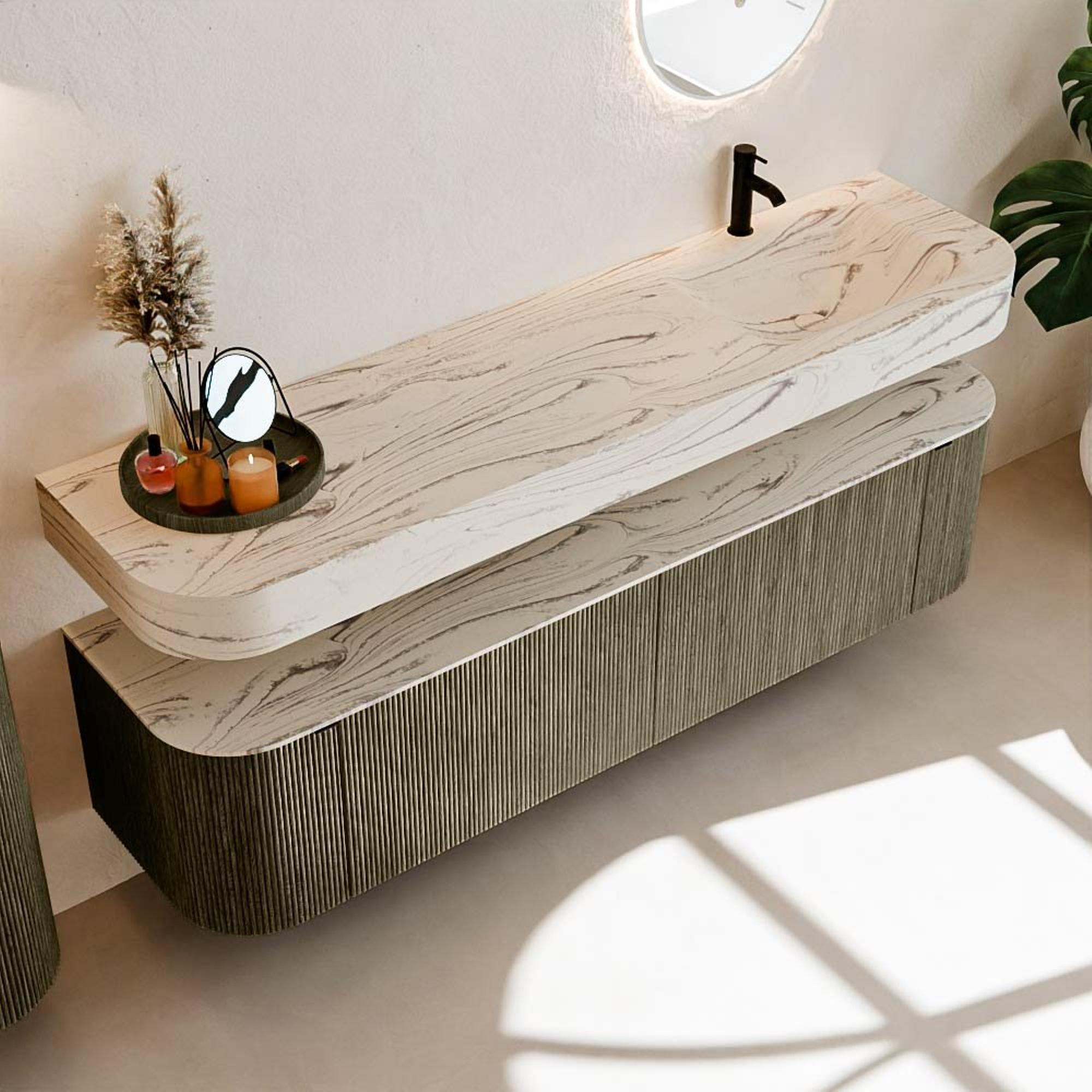 Boven het meubel zweeft een bijpassende, vrij hangende wastafel met afgeronde hoeken – perfect afgestemd op de vorm van de kast. De wastafel is uitgevoerd in Solid Surface en volgt subtiel de lijnen van het onderliggende meubel, waardoor een harmonieus geheel ontstaat. Het Solid Surface topblad vormt een sterke, onderhoudsvriendelijke basis en maakt de combinatie compleet.