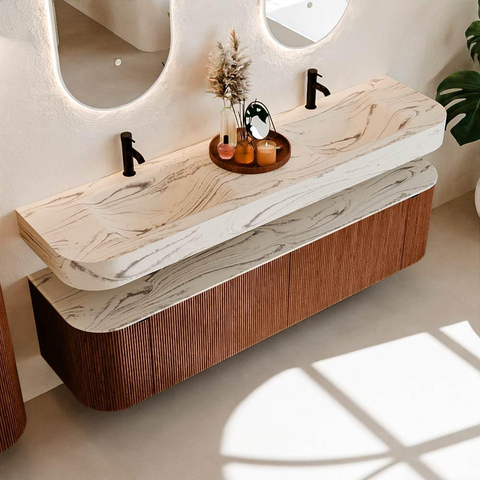 MONDIAZ THOR-DLUX 180cm badmeubel ronding links + rechts kleur Ruby met 2 lades en 2 deuren. Vrijhangende wastafel CLOUD Dubbel 2 kraangaten kleur Nata.