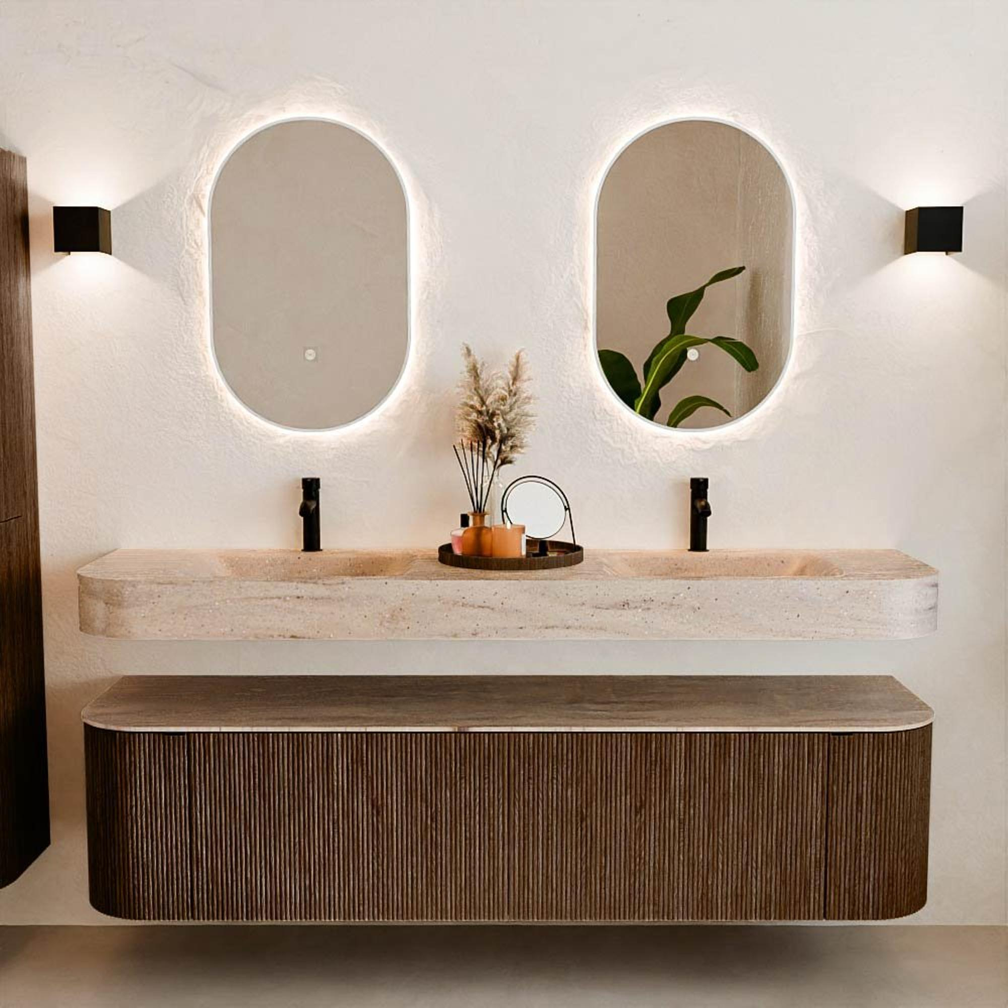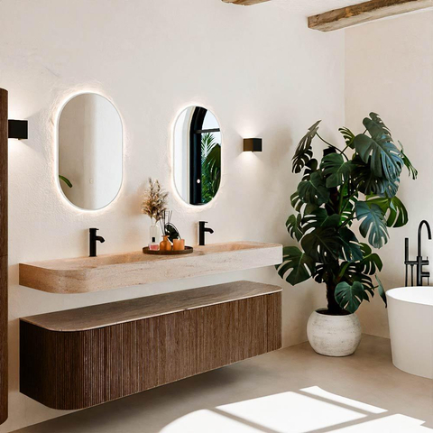 Natuurlijke materialen in warme tinten. De verticale ribbels brengen ritme en textuur in het ontwerp, terwijl het eikenhout zorgt voor een warme, ambachtelijke uitstraling. Kies uit 5 houttinten OAK, WALNUT, DUSK, SHADOW en RUBY zorgvuldig geselecteerde houtkleuren om zowel moderne als klassieke badkamers te verrijken.