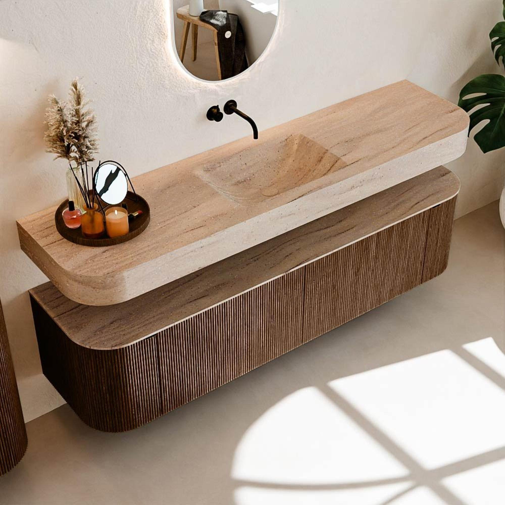 Natuurlijke materialen in warme tinten. De verticale ribbels brengen ritme en textuur in het ontwerp, terwijl het eikenhout zorgt voor een warme, ambachtelijke uitstraling. Kies uit 5 houttinten OAK, WALNUT, DUSK, SHADOW en RUBY zorgvuldig geselecteerde houtkleuren om zowel moderne als klassieke badkamers te verrijken.