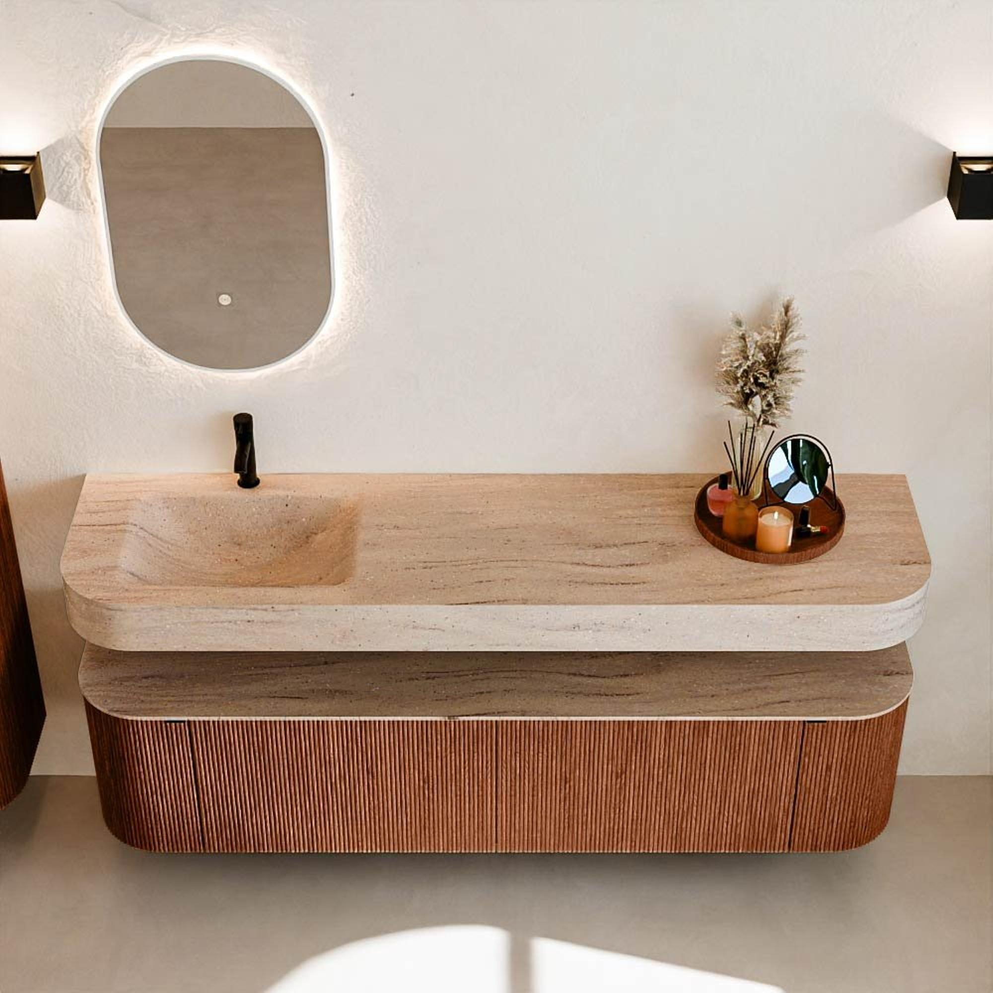 Natuurlijke materialen in warme tinten. De verticale ribbels brengen ritme en textuur in het ontwerp, terwijl het eikenhout zorgt voor een warme, ambachtelijke uitstraling. Kies uit 5 houttinten OAK, WALNUT, DUSK, SHADOW en RUBY zorgvuldig geselecteerde houtkleuren om zowel moderne als klassieke badkamers te verrijken.