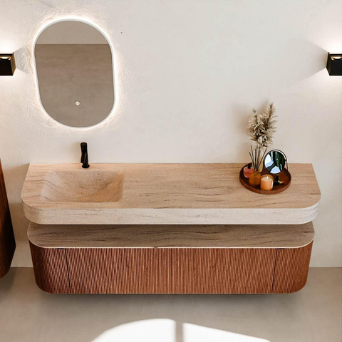 Boven het meubel zweeft een bijpassende, vrij hangende wastafel met afgeronde hoeken – perfect afgestemd op de vorm van de kast. De wastafel is uitgevoerd in Solid Surface en volgt subtiel de lijnen van het onderliggende meubel, waardoor een harmonieus geheel ontstaat. Het Solid Surface topblad vormt een sterke, onderhoudsvriendelijke basis en maakt de combinatie compleet.