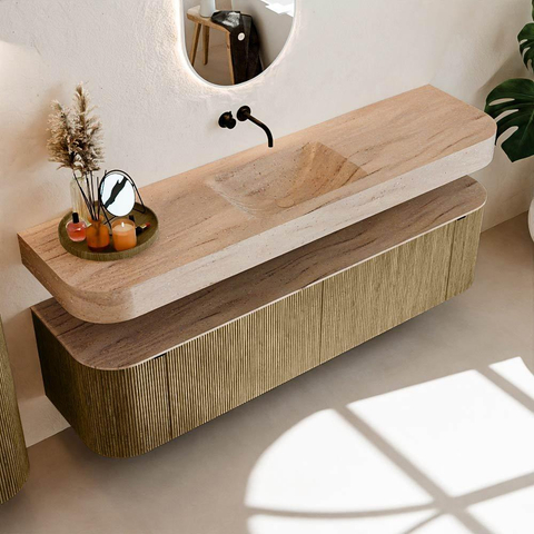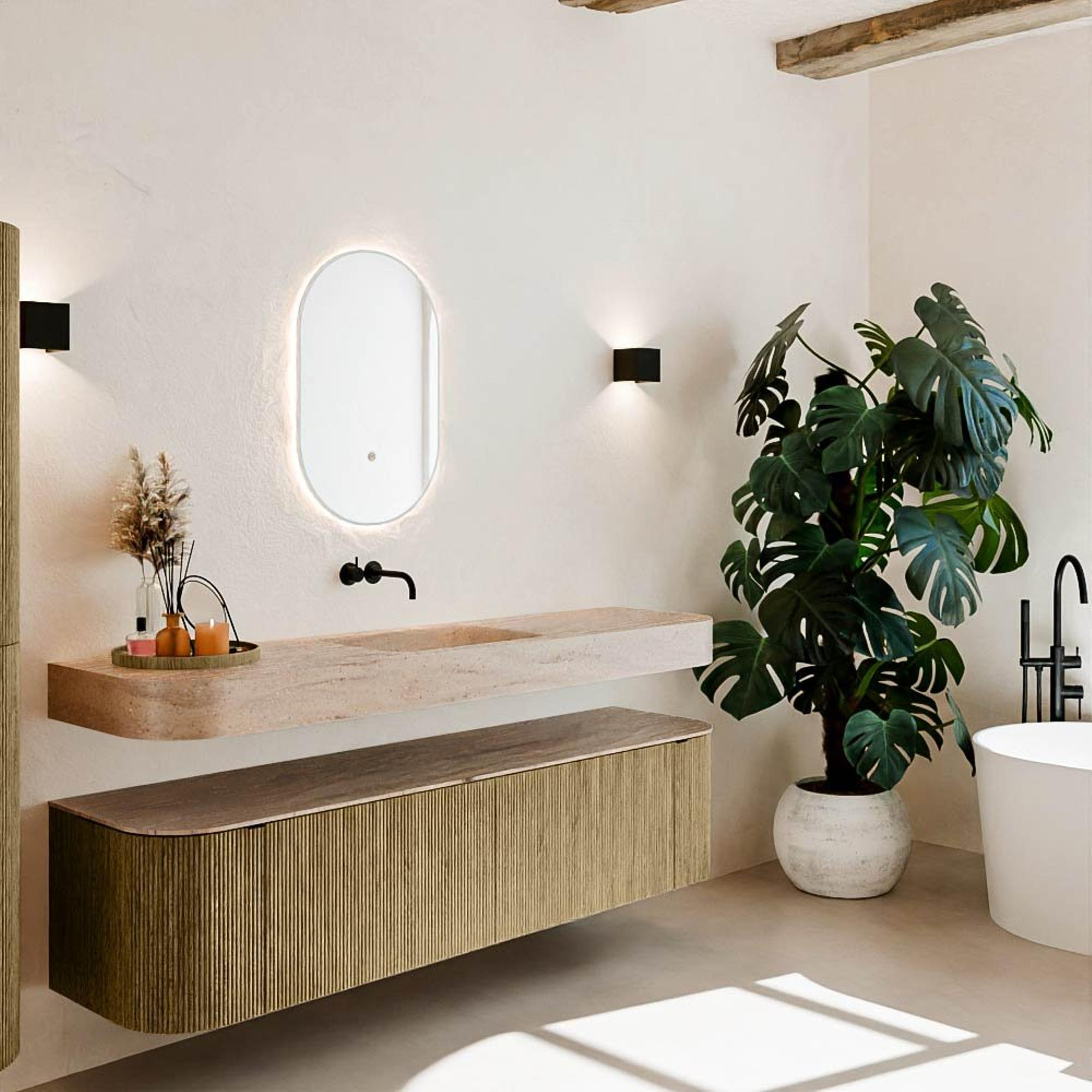 Natuurlijke materialen in warme tinten. De verticale ribbels brengen ritme en textuur in het ontwerp, terwijl het eikenhout zorgt voor een warme, ambachtelijke uitstraling. Kies uit 5 houttinten OAK, WALNUT, DUSK, SHADOW en RUBY zorgvuldig geselecteerde houtkleuren om zowel moderne als klassieke badkamers te verrijken.