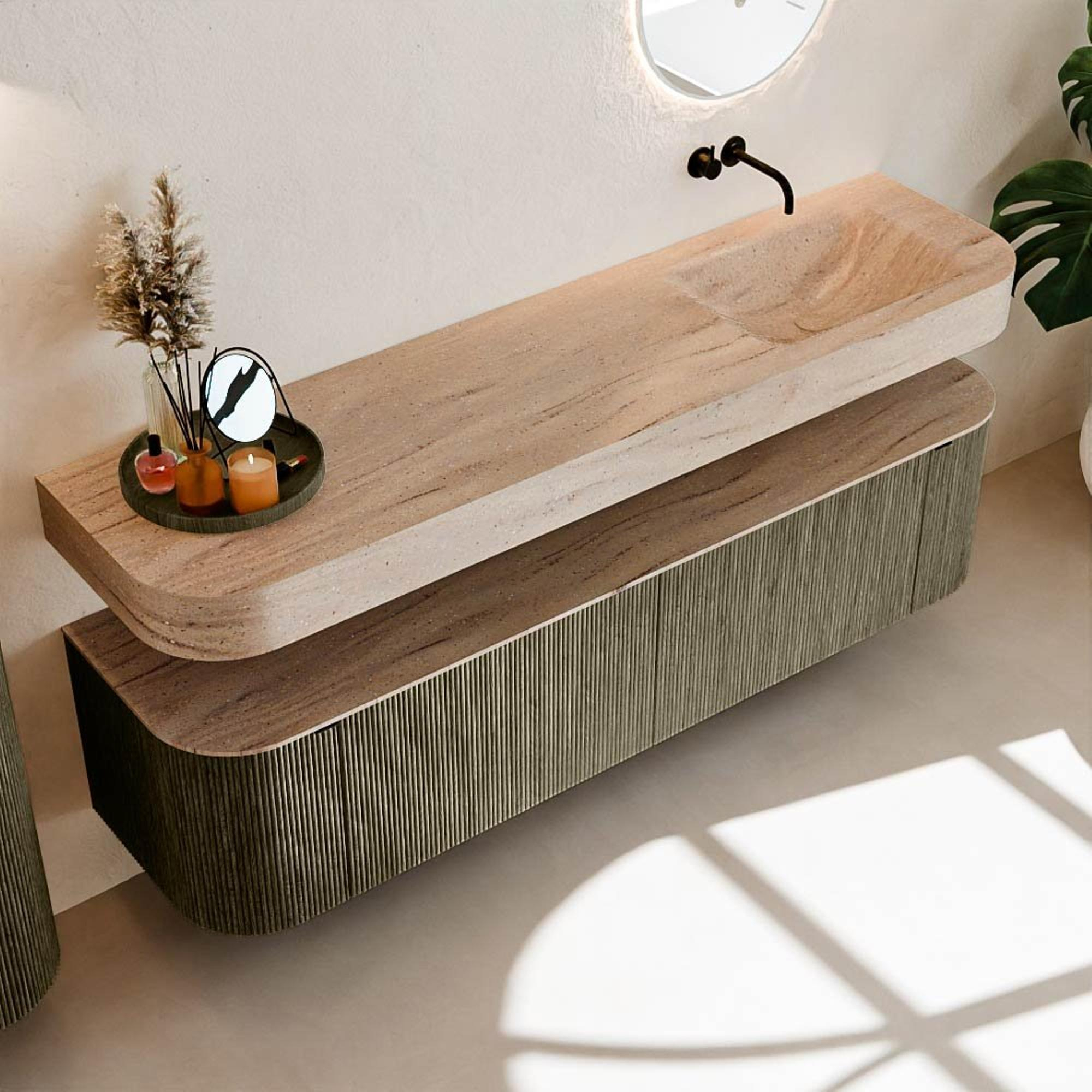 Boven het meubel zweeft een bijpassende, vrij hangende wastafel met afgeronde hoeken – perfect afgestemd op de vorm van de kast. De wastafel is uitgevoerd in Solid Surface en volgt subtiel de lijnen van het onderliggende meubel, waardoor een harmonieus geheel ontstaat. Het Solid Surface topblad vormt een sterke, onderhoudsvriendelijke basis en maakt de combinatie compleet.