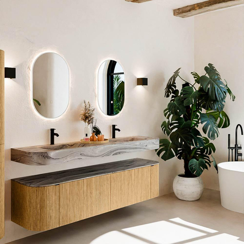 MONDIAZ THOR-DLUX 180cm badmeubel ronding links + rechts kleur Oak met 2 lades en 2 deuren. Vrijhangende wastafel CLOUD Dubbel 2 kraangaten kleur Sombra.